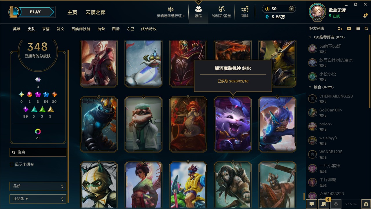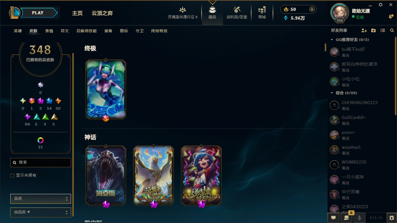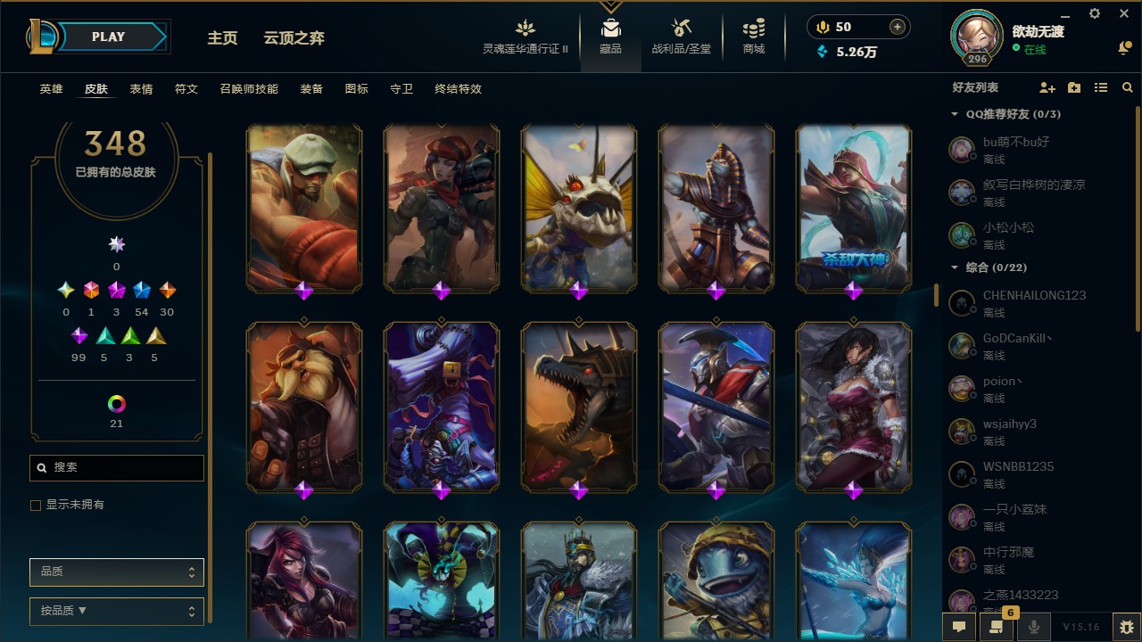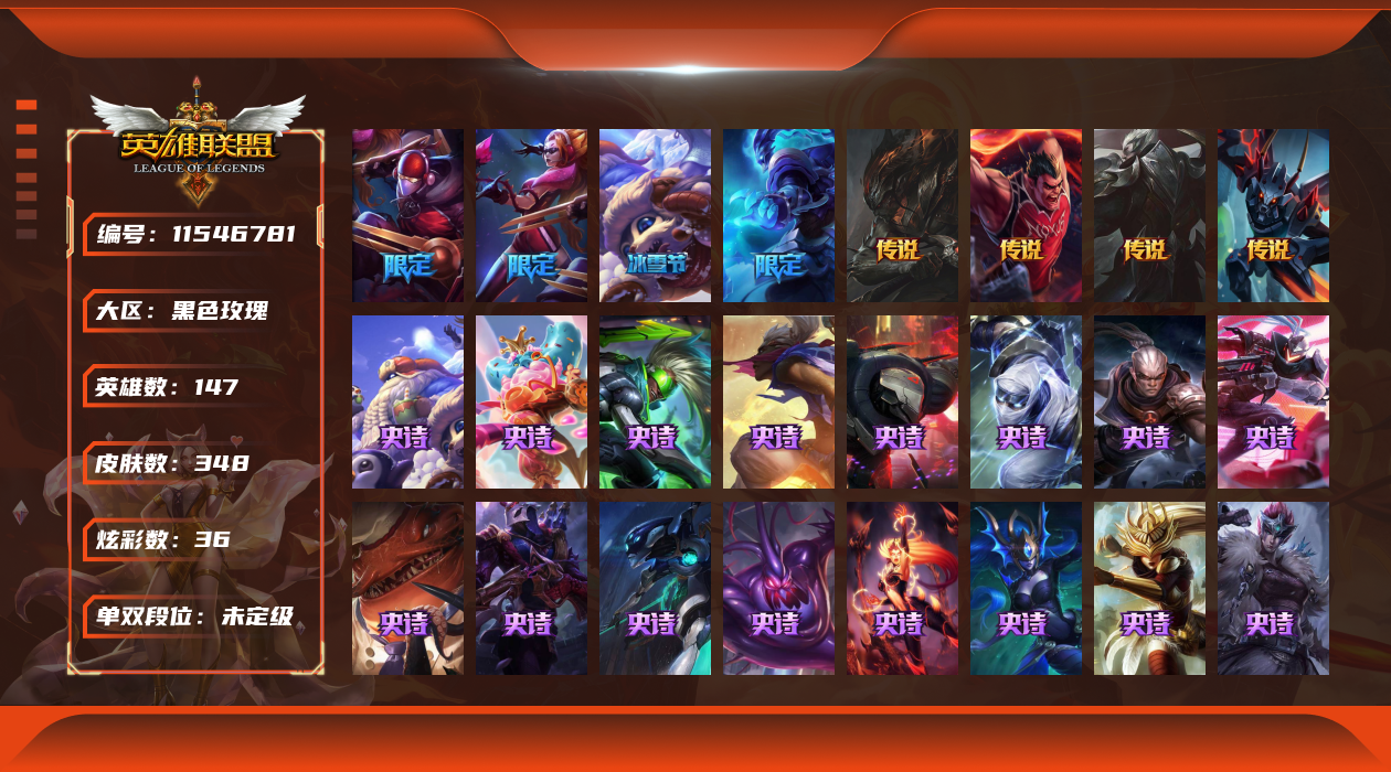 [11546781]可二次 可修改实名 1终极 3神话 5臻彩 54限定 30传说 99史诗 348皮肤 36炫彩 147英雄 皮肤:怨之砂 派克,冰雪游神 巴德,糖果之王 艾翁,冠军典狱长 锤石,深渊恐惧 锤石,源代码 娜美,狂鲨 亚托克斯,女警官 蔚,源计划:自由 艾克,时之砂 艾克,源计划:阴 劫,SKT T1 劫,冲击之刃 劫,德玛西亚警官 卢锡安,源计划:雷 卢锡安,职业杀手 卢锡安,五星大厨 塔姆,腥红之月 烬,布隆·狮心,源代码 卡蜜尔,这货不是维克兹,黑夜使者 亚索,邪恶魔人 扎克,银河魔装机神 纳尔,冰雪兽 纳尔,萌侦探 喵尔摩斯,最后一只恐龙 纳尔,弹幕天使 卡莎,SKT T1 婕拉,鬼影森森 婕拉,野火之藤 婕拉,星之守护者 辛德拉,亚特兰蒂斯 辛德拉,仲裁圣女 辛德拉,死亡之鹰 奎因,勇敢的心 奎因,血羽凤凰 奎因,广寒仙子 嫦娥,暗黑女武神 黛安娜,天启骑士 杰斯,西部魔影 德莱厄斯,神王 德莱厄斯,热血班长 德莱厄斯,灌篮高手 德莱厄斯,生化骑士 德莱厄斯,铁血帝皇 德莱厄斯,霸天异形 卡兹克