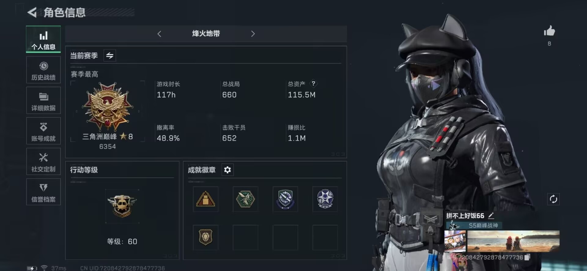 [11546840]总资产:115.5M 1干员外观 7传说枪械 哈夫币:18.089K 高级安全箱(9.17到期) 可二次 可修改实名 烽火地带段位:三角洲巅峰 全面战场段位:军士长 传说武器皮肤:M16A4突击步枪-狩猎时刻,CAR-15突击步枪-阿米娅,复合弓-黑-天际线,Vector冲锋枪-狩猎时刻,G3战斗步枪-狩猎时刻,勇士冲锋枪-能天使-午夜邮差,725双管霰弹枪-送葬人-无题密令 史诗武器皮肤:M700狙击步枪-蝮蛇,SVD狙击步枪-暗夜猎手,M16A4突击步枪-竞赛选手,PKM通用机枪-荒野求生,MP5冲锋枪-深海恐惧,AKM突击步枪-林中猎手,M1014霰弹枪-林中猎手,PTR-32突击步枪-英雄,AS Val突击步枪-典狱官,PSG-1射手步枪-无垢,S12K霰弹枪-曙光 干员外观:露娜-黑·天际线