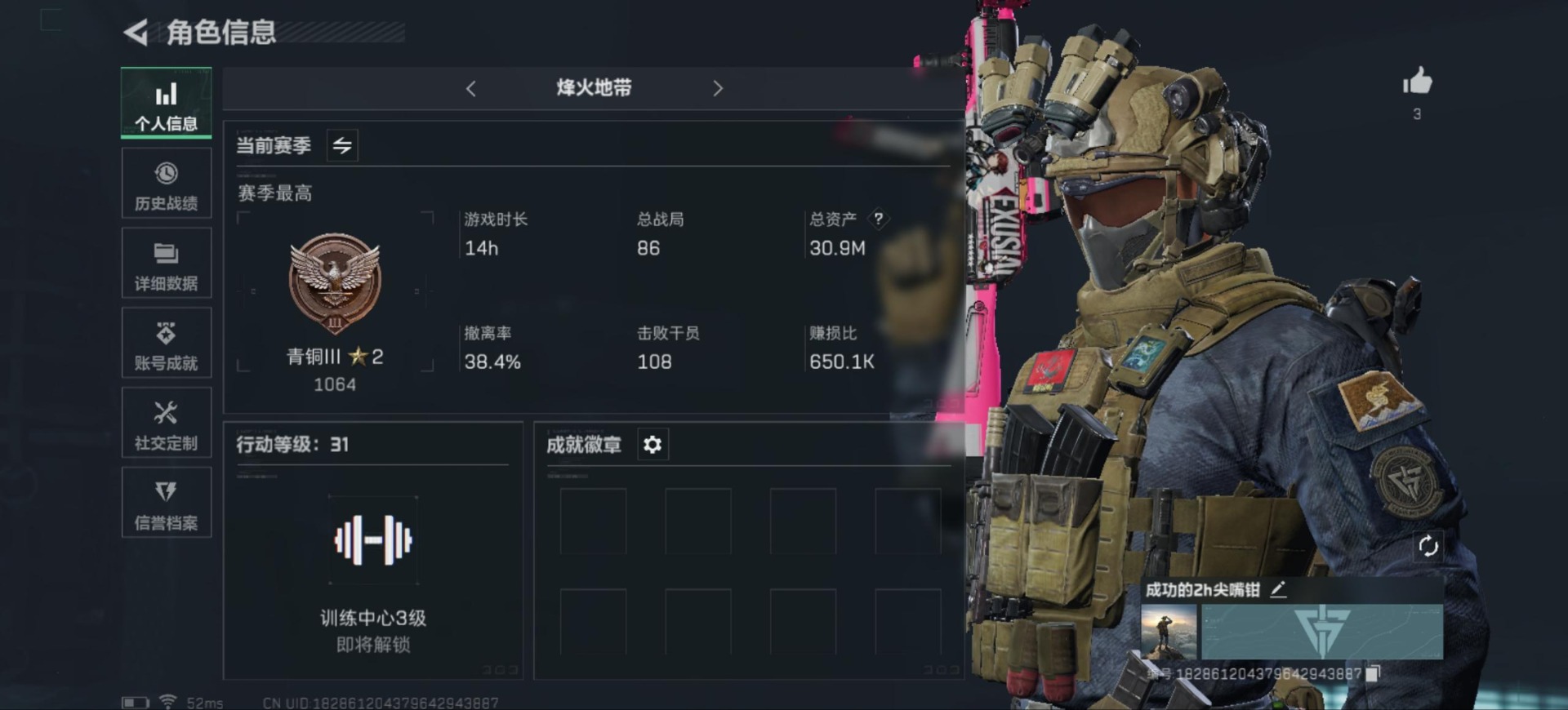 [11546986]总资产:30.9M 2传说枪械 哈夫币:14.765K 可二次 可修改实名 烽火地带段位:青铜 全面战场段位:无段位 传说武器皮肤:M4A1突击步枪-阿米娅,勇士冲锋枪-能天使-午夜邮差
