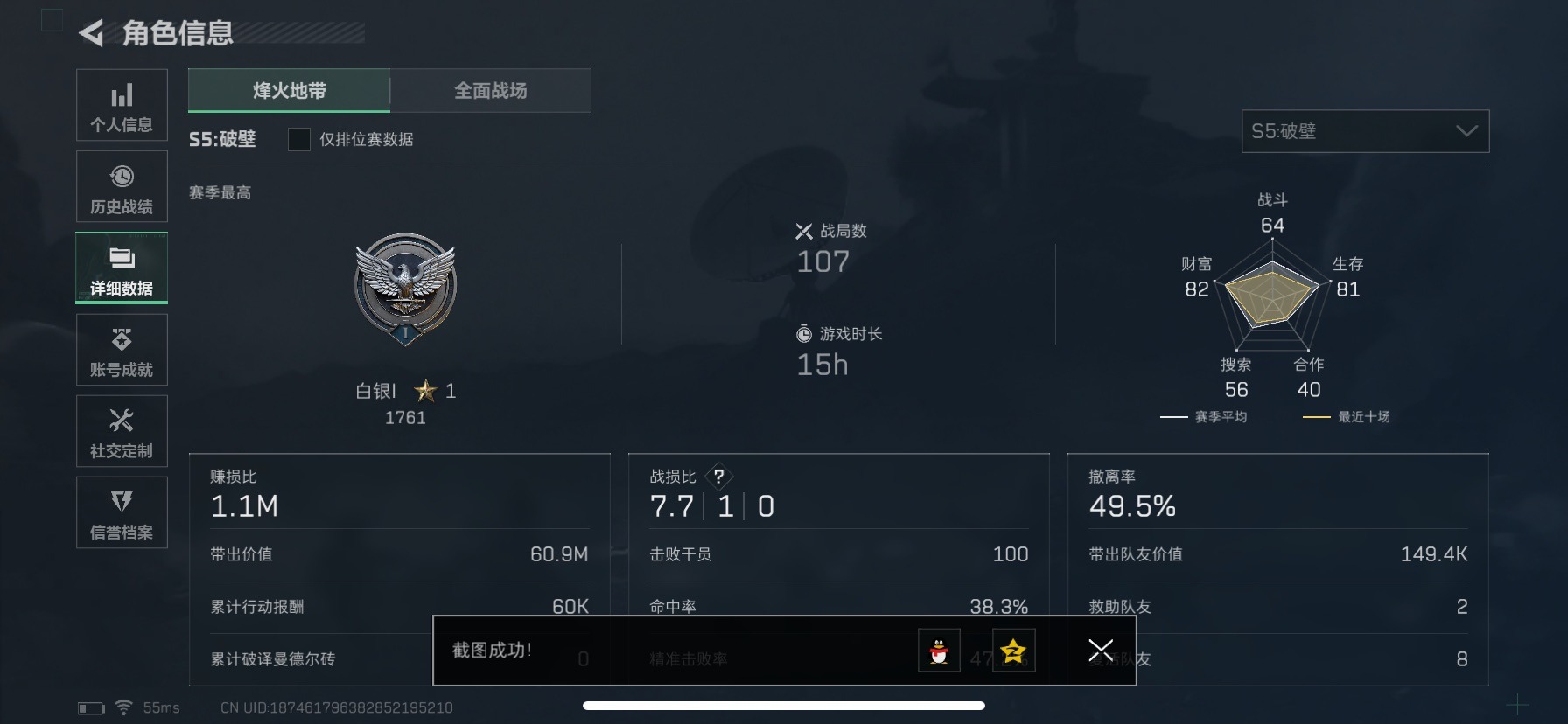[11547005]总资产:49.8M 1传说枪械 哈夫币:43.707K 可二次 可修改实名 烽火地带段位:白银 全面战场段位:无段位 传说武器皮肤:勇士冲锋枪-能天使-午夜邮差 史诗武器皮肤:M700狙击步枪-蝮蛇,SV-98狙击步枪-林中猎手,SV-98狙击步枪-囚徒,沙漠之鹰-曙光