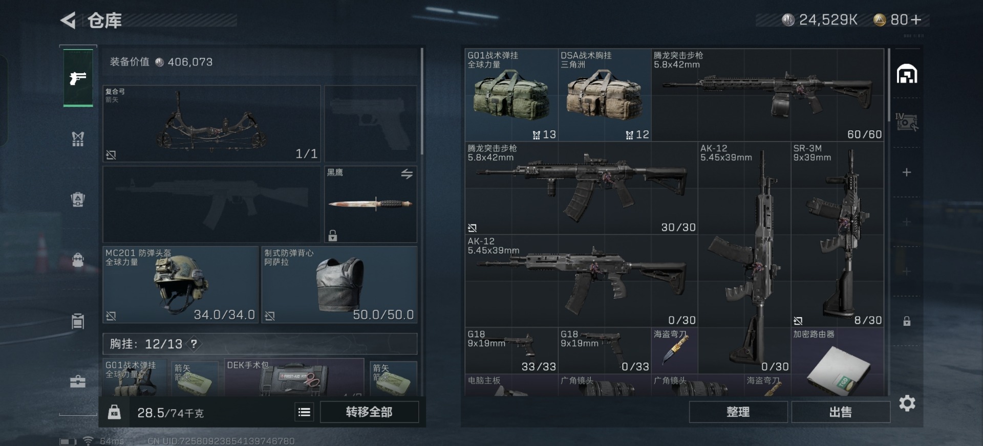 [11547106]总资产:38.8M 8传说枪械 哈夫币:24.529K 可二次 可修改实名 烽火地带段位:钻石 全面战场段位:尉官 传说武器皮肤:SR-25射手步枪-水墨云图,M4A1突击步枪-阿米娅,CAR-15突击步枪-阿米娅,复合弓-黑-天际线,AK-12突击步枪-特斯拉线圈,SR-3M紧凑突击步枪-特斯拉线圈,UZI冲锋枪-特斯拉线圈,勇士冲锋枪-能天使-午夜邮差 史诗武器皮肤:M16A4突击步枪-竞赛选手,QBZ95-1突击步枪-曙光