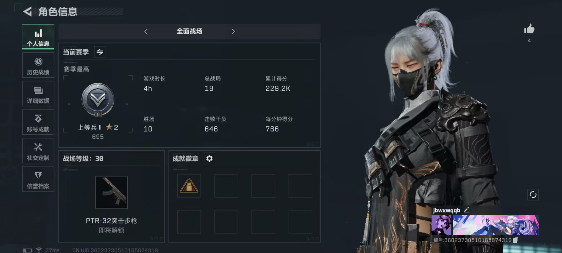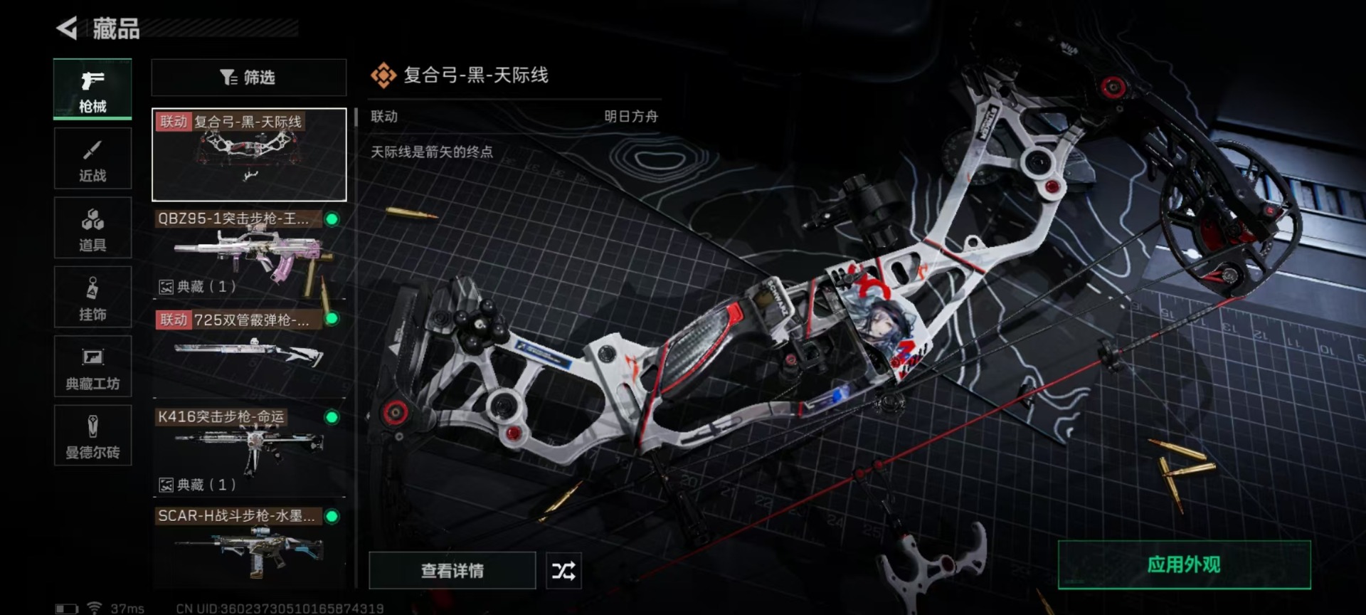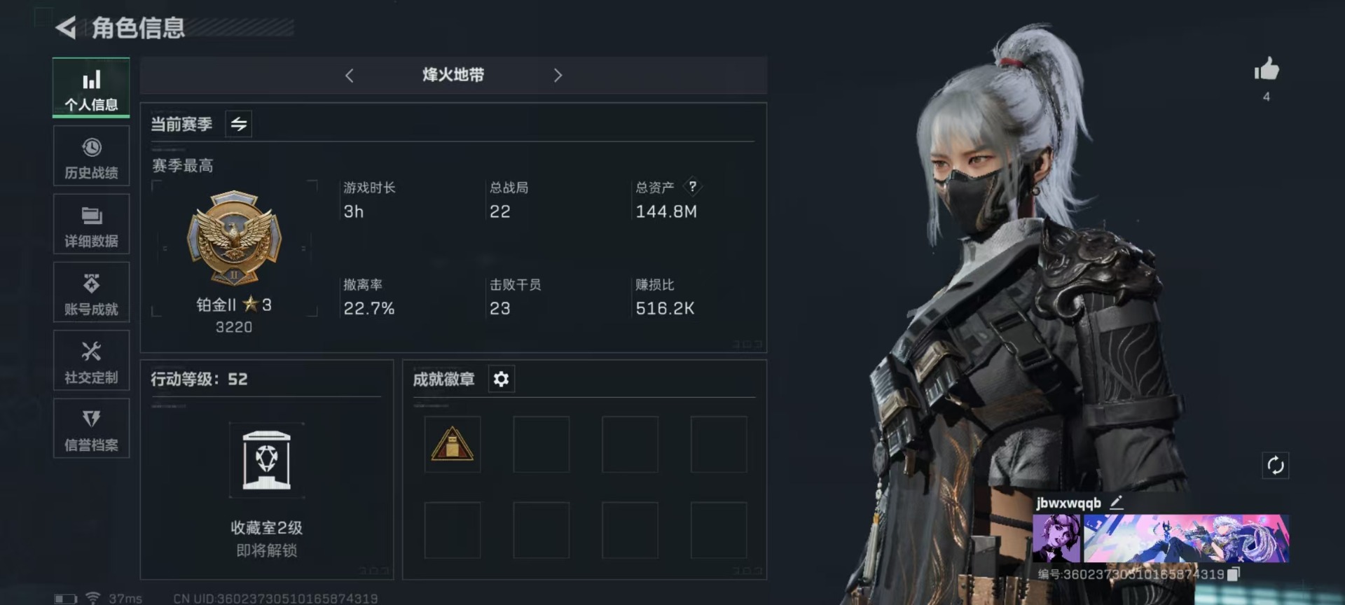 [11547133]总资产:144.8 1近战传说 6传说枪械 高级安全箱(9.17到期) 可二次 可修改实名 优质装备:近战-黑海,K416突击步枪-命运(典藏),QBZ95-1突击步枪-王牌之剑(典藏) 烽火地带段位:铂金 全面战场段位:上等兵 哈夫币:22.844 传说武器皮肤:SCAR-H战斗步枪-水墨云图,复合弓-黑-天际线,725双管霰弹枪-送葬人-无题密令 史诗武器皮肤:M16A4突击步枪-竞赛选手,SV-98狙击步枪-林中猎手,PSG-1射手步枪-无垢,SCAR-H战斗步枪-囚徒,Vector冲锋枪-阿萨拉文明