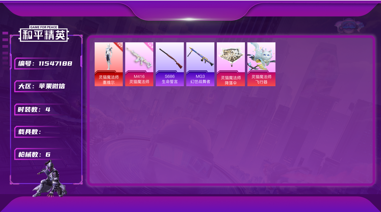 [11547188]1红装 1特效枪 可二次 可修改实名 优质装备:灵猫魔法师-塞维尔,一级灵猫魔法师-塞维尔,M416-灵猫魔法师 时装数:4 枪械数:6 战备数:0 三级特效枪:三级M416-灵猫魔法师 优质战备:灵猫魔法师飞行器,灵猫魔法师降落伞
