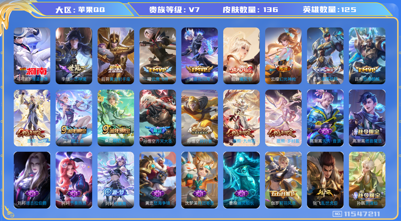 [11547211]V7 1珍品传说 12传说 125英雄 136皮肤 可修改实名 优质装备:怪盗基德,黄金射手座,云鹰飞将(小将军),一念神魔,澜逐花归海 传说皮:貂蝉曦玄引,幻光神枪 珍宝阁皮:妄想食味 限定皮:愿照·九州拓(澜年限),愿照·岁时盈(虞姬年限),愿照·山河定(司空震年限),逐霄战戟,陌上桑,鸣野蒿,齐天大圣,怒海麟威,孙行者 史诗皮:狼魂孤将,绮世丹青,化蝶舞,星界特工,龙之律动,石田雨龙,茶境仙,破空之剑,埋骨钱,怒海争锋,蔬乡物语(鲁班七号),超元猎域,百相守梦-百里守约,紫霞仙子,特工魅影,千年之狐,高渐离燃音魔法,魅语,猫狗日记-孙策,乱世虎臣,节奏热浪,水果甜心,绅士熊喵,心灵骇客,德古拉伯爵,暗隐猎兽者,幽灵船长,鬼剑武藏,心灵战警,乐园奇幻夜,天秀·启明,纤云弄巧,缤纷独角兽,逐浪之夏,月团寄思,水晶猎龙者,箭羽风息,鹰眼统帅,暗夜贵公子,魅力维加斯,天秀·音浪,未来纪元-赵云