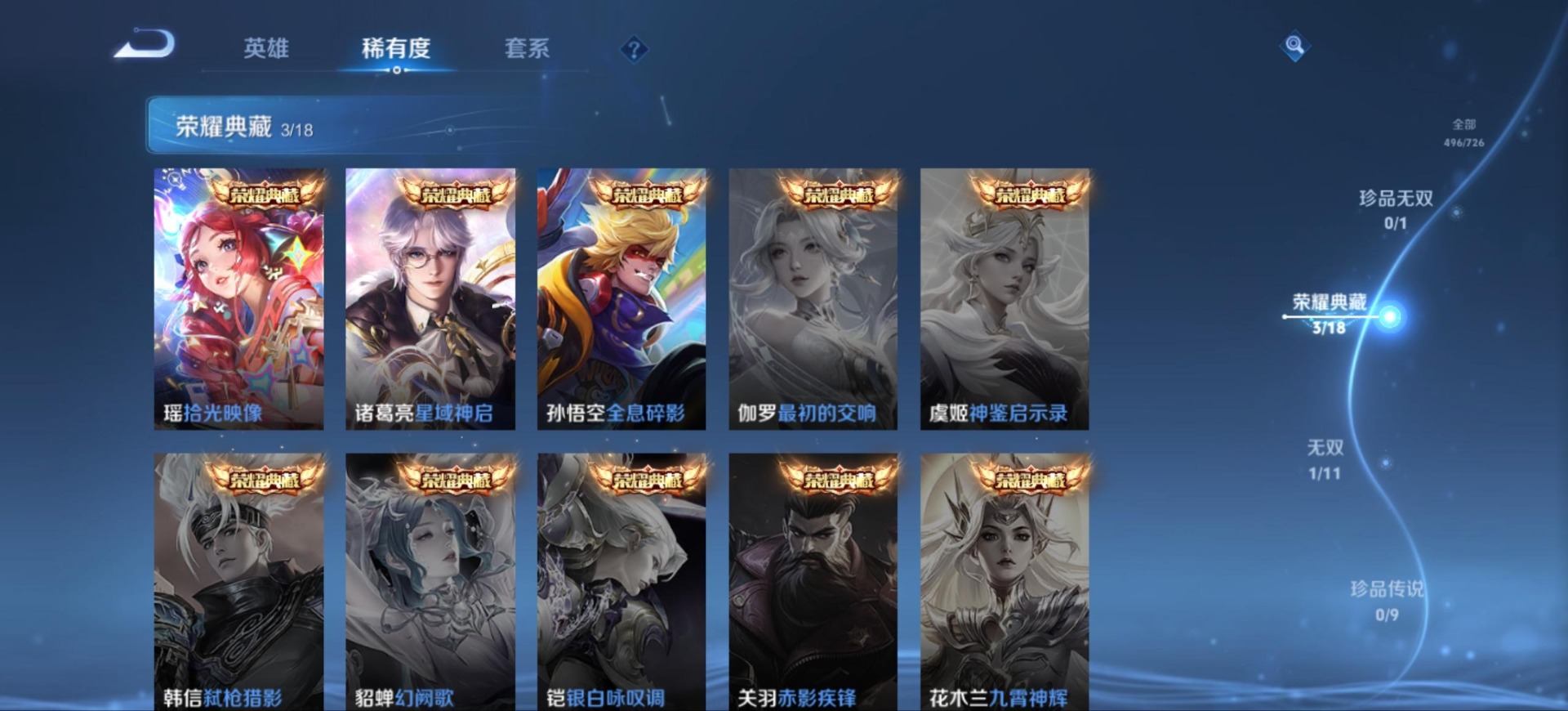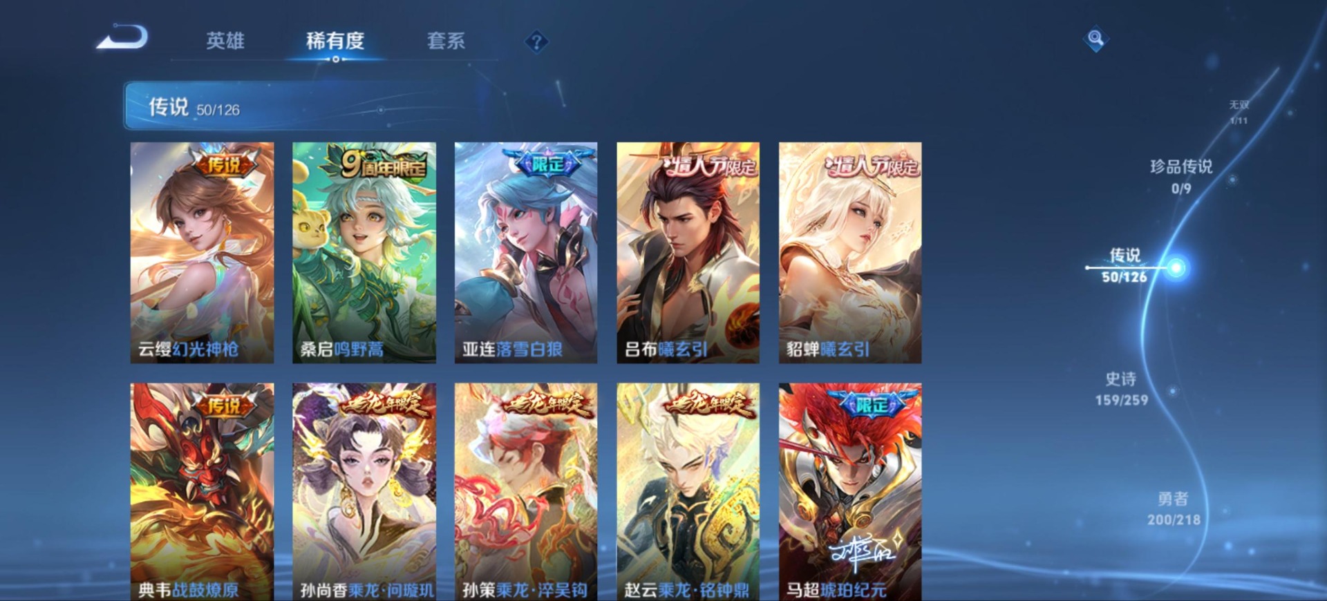 大乔白鹤梁神女,曹操天狼征服者,伽罗天狼溯光者,孙膑天狼运算者,干将莫邪冰霜恋舞曲,典韦岱宗,牛魔奔雷神使,鲁班七号乒乒小将,项羽霸王别姬,吕布御风骁将,露娜一生所爱,诸葛亮时雨天司,杨玉环寅虎·心曲,兰陵王默契交锋,公孙离祈雪灵祝,公孙离玉兔公主,公孙离蜜橘之夏,裴擒虎李小龙,裴擒虎寅虎·赤拳,上官婉儿梁祝,上官婉儿天狼绘梦者,花木兰青春决赛季,马可波罗逐梦之星,马可波罗山海·玄木吟,桑启鸣野蒿,孙悟空孙行者,孙悟空大圣娶亲,芈月白晶晶,孙悟空至尊宝,孙悟空美猴王,马超神威,赵云引擎之心,妲己时之彼端,韩信飞衡,韩信逐梦之影,百里守约朱雀志,瑶山海·碧波行,虞姬霸王别姬,关羽冰锋战神