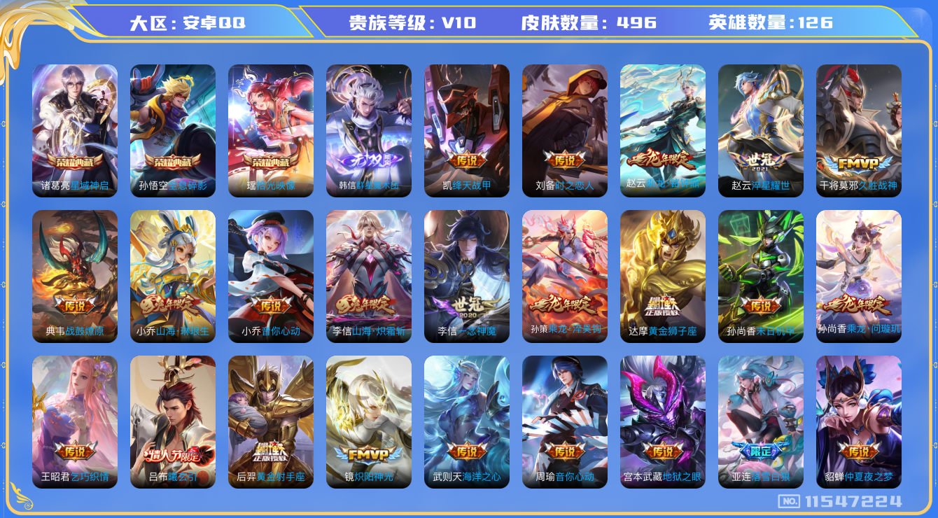[11547224]V10 3典藏 1无双 50传说 126英雄 496皮肤 典藏英雄武则天 可修改实名 连体和平 优质装备:全息碎影(猴子典藏),星域神启(倪克斯贼亮),韩信群星魔术团(韩信无双),拾光映像(瑶典藏),黄金狮子座,黄金射手座,冠军飞将,云鹰飞将(小将军),绛天战甲(鸡嘴战神),黄金白羊座,猫影幻舞,久胜战神,炽阳神光,一念神魔,云霓雀翎,末日机甲-孙尚香(绿蚂蚱),地狱火,仲夏夜之梦(大飞蛾),音你心动-小乔,零号·赤焰,海洋之心,地狱之眼,飞鸢探春,音你心动-周瑜,胖达荣荣,李逍遥,乞巧织情,时之恋人-刘备(电焊工),游龙清影(小青龙),淬星耀世,超时空战士-狄仁杰,碎云,山海·炽霜斩(李信年限),山海·琳琅生(小乔年限),山海·苍雷引(电光曜子),艾琳觅芳踪,琥珀纪元马超 传说皮:乘龙·问璇玑(孙尚香年限),乘龙·铭钟鼎(赵云年限),乘龙·淬吴钩(孙策年限),貂蝉曦玄引,吕布曦玄引,典韦战鼓燎原,落雪白狼,幻光神枪 珍宝阁皮:妄想食味,胡桃夹子,女武神 限定皮:逐霄战戟,鸣野蒿,至尊宝,凤求凰(白切鸡),时之彼端,白鹤梁神女,白晶晶,时雨天司(水龙头),神威(电光马子),飞衡(韩信年限),山海·碧波行(瑶年限),高山流水,齐天大圣,五谷丰年,冰锋战神,天狼运算者,游园惊梦,梁祝,御风骁将(吕布年限),逐梦之星,岱宗(典韦年限),天狼溯光者,天狼征服者,奔雷神使(牛魔年限),祈雪灵祝(雪兔子),天狼绘梦者,李小龙,逐梦之影,朱雀志(守约年限),霸王别姬-项羽,霸王别姬-虞姬,默契交锋-兰陵王,孙行者,一生所爱,大圣娶亲,引擎之心,天魔缭乱,青春决赛季,冰霜恋舞曲,乒乒小将,蜜橘之夏,美猴王,寅虎·心曲(虎婆),寅虎·赤拳(老虎年限),玉兔公主,山海·玄木吟(马可年限) 史诗皮:赞萌露比,鸭鸭历险记-刘禅,化蝶舞,星界战将,灵蛊蚀心,龙之律动,石田雨龙,百相守梦-周瑜,戍鼓铭心,茶境仙,幻珠鲛人,海诺心动手记,破空之剑,蒙犽顽岩魄,怒海争锋,决胜骁骑,蔬乡物语(鲁班七号),曹操夜都魔契,超元猎域,乘龙·聚宝船(安琪拉年限),乘龙·忆丹青(大乔年限),琥珀纪元伽罗,百相守梦-百里守约,百相守梦-黄忠,遇见神鹿,紫霞仙子,苍穹之光,电玩小子(小书包),白龙吟,黄金分割率,特工魅影,千年之狐,永昼,电玩·爆裂旋风,江河有灵,百解令(蒙犽),高渐离燃音魔法,蒙恬荣光圣徽