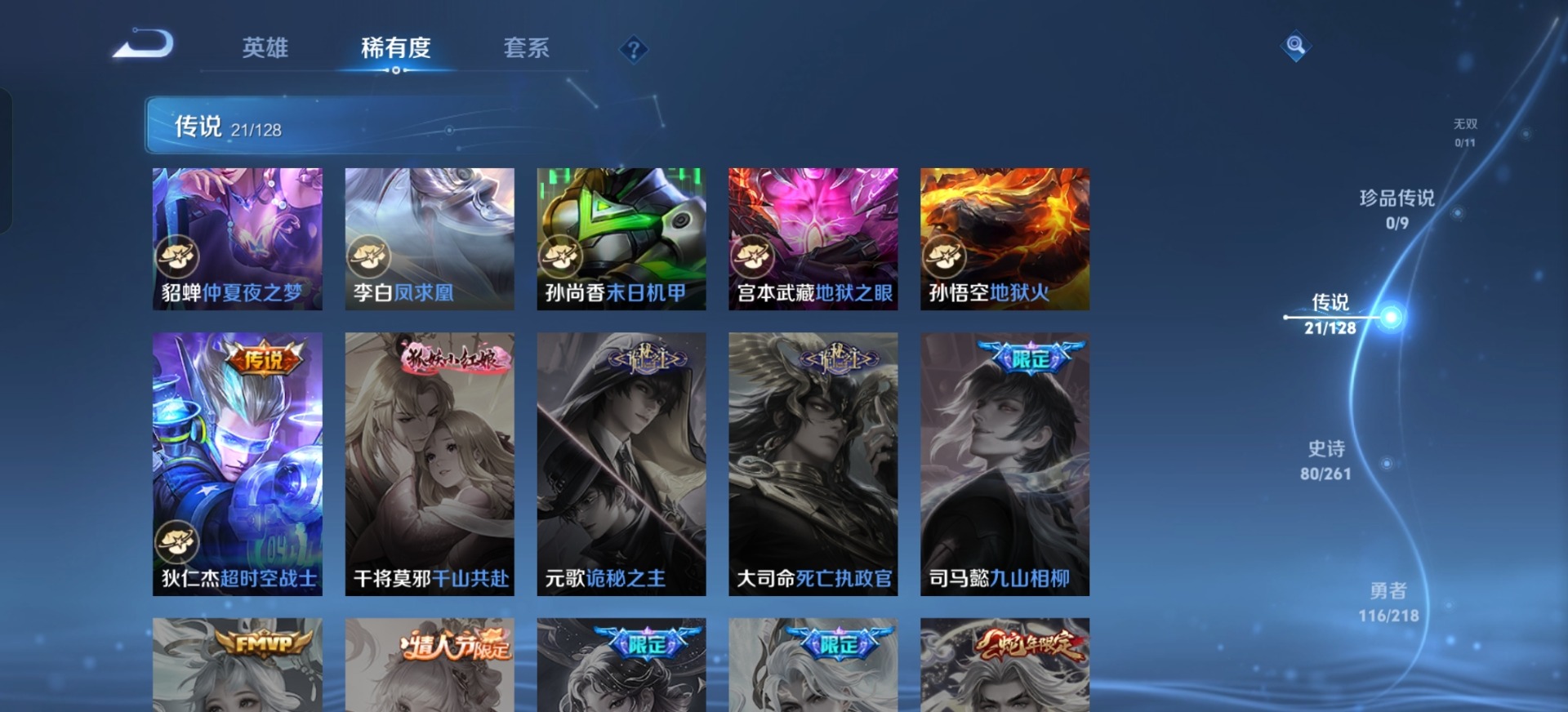 曹操天狼征服者,伽罗天狼溯光者,伽罗太华,鲁班七号乒乒小将,项羽霸王别姬,吕布御风骁将,后羿辉光之辰,诸葛亮时雨天司,公孙离祈雪灵祝,裴擒虎李小龙,上官婉儿梁祝,花木兰默契交锋,花木兰青春决赛季,马可波罗逐梦之星,猪八戒猪悟能,芈月白晶晶,孙悟空至尊宝,马超神威,雅典娜神奇女侠,妲己时之彼端,韩信傲雪梅枪,韩信飞衡,韩信逐梦之影,虞姬霸王别姬,王昭君凤凰于飞,关羽武圣