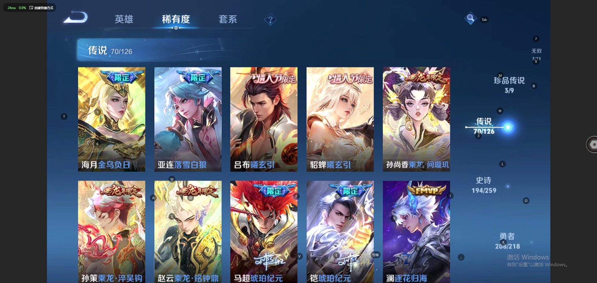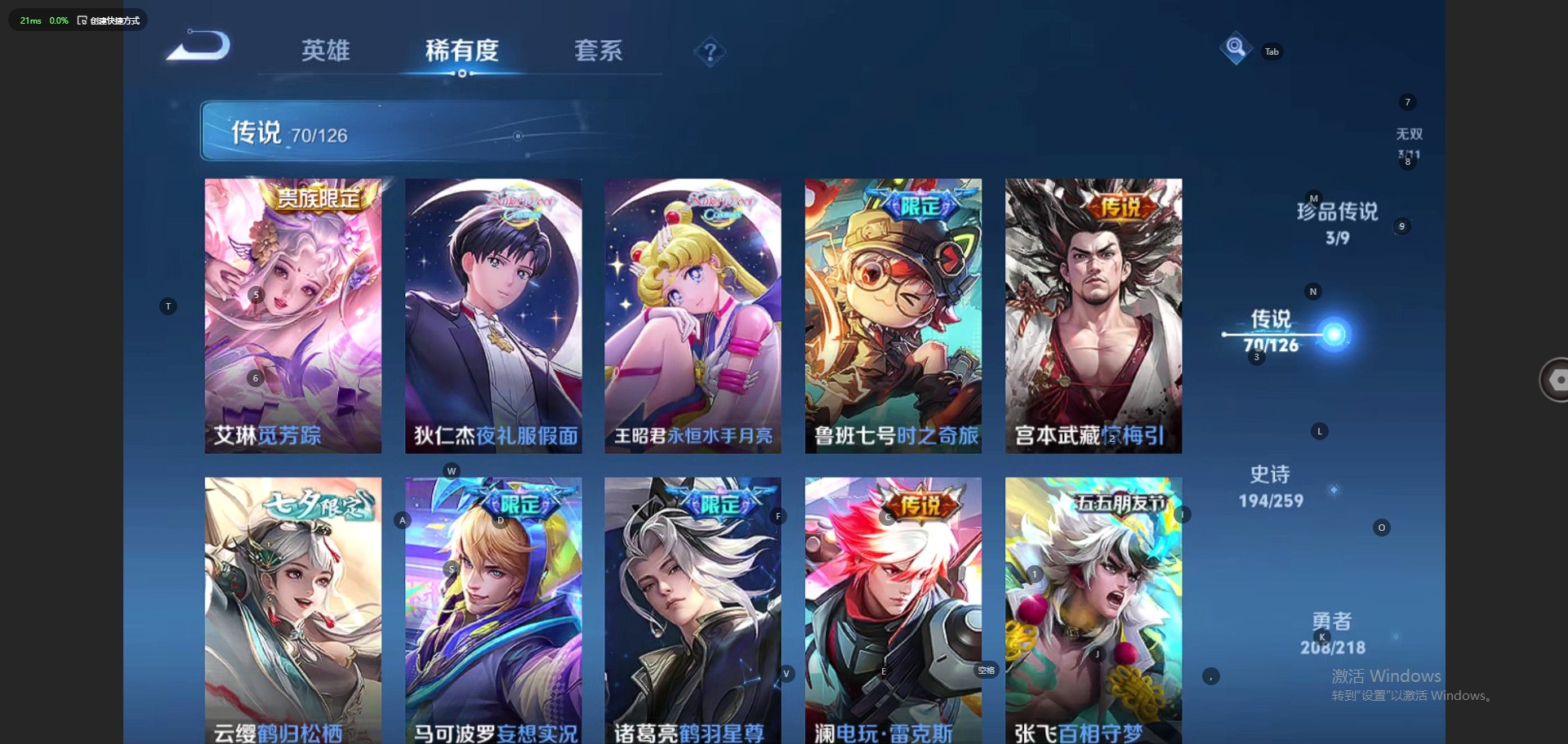 - [11528662]V6 7传说 90英雄 78皮肤 可修改实名 优质装备:末日机甲-孙尚香(绿蚂蚱) 传说皮:乘龙·问璇玑(孙尚香年限),貂蝉曦玄引,幻光神枪 限定皮:愿照·众生和(妲己年限),鸣野蒿,山海·碧波行(瑶年限),时之祈愿-瑶(瑶传限) 史诗皮:猫狗日记-孙策,乱世虎臣,女仆咖啡,摇滚巨星,水果甜心,星夜王子,时之奇旅-安琪拉,鬼剑武藏,诗语江南,乘风破浪,唤灵魅影,圣诞恋歌,鹰眼统帅,魅力维加斯