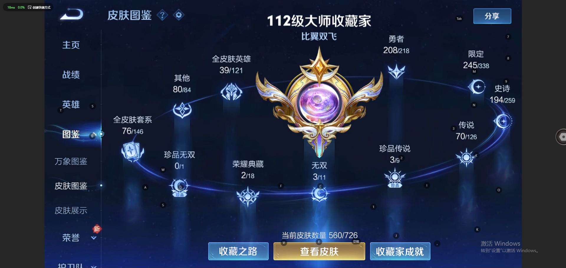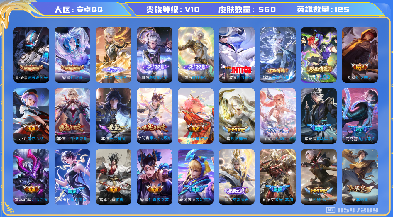 - [11318677]王者荣耀-安卓QQ 贵族6 星元皮肤1 传说皮肤3 史诗皮肤51 皮肤数量262 皮肤价值:147228 英雄125 至尊星耀II 总场次6047 【内测皮肤】2 高渐离_玩趣恶龙 嬴政_优雅恋人【星元皮肤】1 金色仲夏夜 【传说皮肤】3 赵云_乘龙铭钟鼎 宫本武藏_惊梅引 孙悟空_零号赤焰 【史诗皮肤】51 狂铁_龙之律动 黄忠_百相守梦 周瑜_百相守梦 云缨_赞萌露比 朵莉亚_幻珠鲛人 狄仁杰_魔术师 赵云_皇家上将 铠_曙光守护者 花木兰_水晶猎龙者 韩信_傲雪梅枪 阿古朵_江河有灵 鬼谷子_五谷丰年 庄周_高山流水 裴擒虎_李小龙 上官婉儿_梁祝 甄姬_游园惊梦 鲁班七号_蔬乡物语 高渐离_燃音魔法 司空震_地狱燃心 黄忠_火炮绅士 干将莫邪_真爱魔法 元歌_云间偶戏 孙悟空_孙行者 橘右京_修罗 孙策_猫狗日记 阿轲_节奏热浪 白起_星夜王子 程咬金_功夫厨神 李元芳_逐浪之夏 蔡文姬_舞动绿茵 百里守约_特工魅影 安琪拉_心灵骇客 雅典娜_冰冠公主 诸葛亮_黄金分割率 兰陵王_暗隐猎兽者 刘邦_德古拉伯爵 妲己_魅力维加斯 宫本武藏_鬼剑武藏 廉颇_地狱岩魂 吕布_圣诞狂欢 墨子_金属风暴 孙尚香_水果甜心 王昭君_偶像歌手 甄姬_冰雪圆舞曲 蒙犽_百解令 元歌_无心 嫦娥_拒霜思 云中君_纤云弄巧 蔡文姬_繁星吟游 狄仁杰_鹰眼统帅