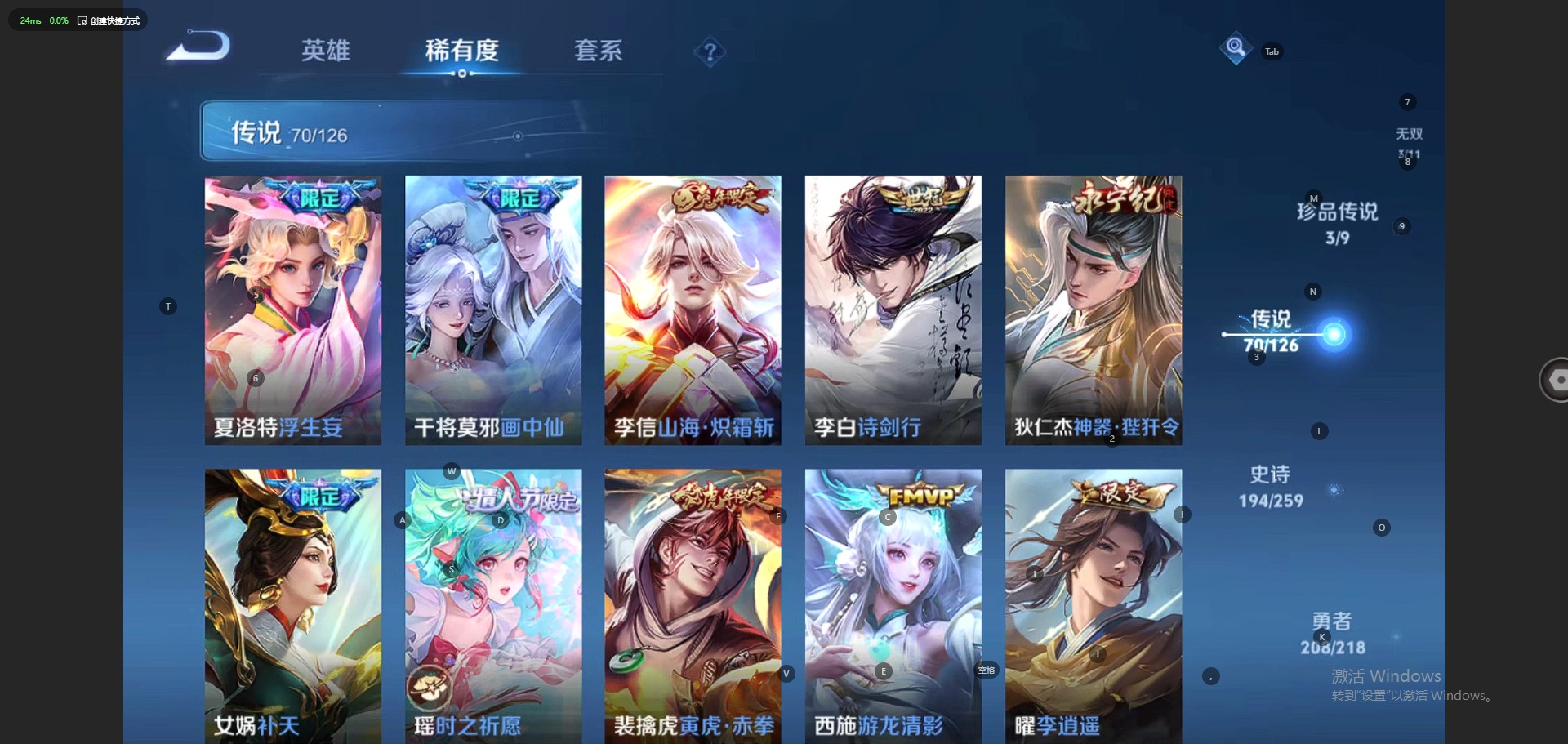 - PX_2088175-实名: 不可修改 贵族等级: V7 英雄数: 125 皮肤数: 169 荣耀水晶: 全息碎影 无双皮: 器灵·螭龙剑 传说皮: 炽阳神光,无双飞将,神器·狴犴令,山海·苍雷引,霜月吟,澜逐花归海 限定皮: 遇见飞天,龙胆,白晶晶,寅虎·赤拳,五谷丰年,诗剑行,山海·玄木吟,鸣野蒿