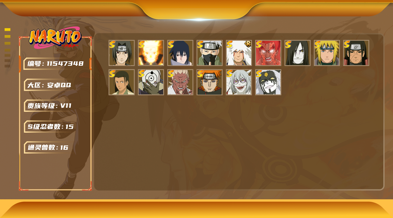 [11547348]V11 15S忍 44A忍 16通灵 764.9W战力 可二次 可修改实名 优质装备:千手柱间「秽土转生」,药师兜「仙人模式」,迈特凯「死门」,“宇智波斑” 「白面具」,漩涡鸣人 「九喇嘛连结」,宇智波佐助「永恒万花筒」,千手柱间·木叶创立,大筒木桃式,艾「忍界大战」,旗木卡卡西「须佐能乎」 S级忍者:自来也 「舞之豪杰」,宇智波鼬 「须佐能乎」,佩恩「天道」,波风水门,大蛇丸
