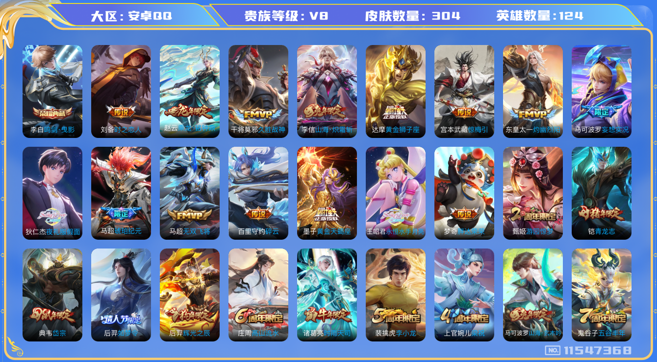 [11547368]V8 1典藏 20传说 124英雄 304皮肤 可修改实名 优质装备:鸣剑·曳影,黄金狮子座,久胜战神,胖达荣荣,时之恋人-刘备(电焊工),无双飞将,碎云,山海·炽霜斩(李信年限),灼幽烈阳,妄想实况,惊梅引,永恒水手月亮,夜礼服假面,琥珀纪元马超,黄金天蝎座 传说皮:乘龙·铭钟鼎(赵云年限) 珍宝阁皮:妄想食味,优雅恋人 限定皮:愿照·岁时盈(虞姬年限),鸣野蒿,补天,时雨天司(水龙头),飞衡(韩信年限),高山流水,五谷丰年,青龙志(铠年限),游园惊梦,梁祝,岱宗(典韦年限),李小龙,辉光之辰,如梦令-后羿,大圣娶亲,山海·玄木吟(马可年限) 史诗皮:化蝶舞,星界特工,星界战将,茶境仙,蒙犽顽岩魄,琥珀纪元伽罗,百相守梦-百里守约,百相守梦-黄忠,紫霞仙子,苍穹之光,白龙吟,黄金分割率,特工魅影,千年之狐,永昼,百相守梦(刘备),电玩·爆裂旋风,真我赫兹(百里守约),鹤归松栖(赵怀真),江河有灵,百解令(蒙犽),高渐离燃音魔法,蒙恬荣光圣徽,偶像歌手,晚萤,末日机甲-吕布,猫狗日记-孙策,乱世虎臣,节奏热浪,摇滚巨星,水果甜心,天才门将,星夜王子,心灵骇客,功夫厨神,德古拉伯爵,暗隐猎兽者,幽灵船长,鬼剑武藏,心灵战警,乐园奇幻夜,舞动绿茵,地狱岩魂,拒霜思,缤纷独角兽,乘风破浪,逐浪之夏,月团寄思,水晶猎龙者,曙光守护者,箭羽风息,金属风暴,原初追逐者,圣诞狂欢,圣诞恋歌,鹰眼统帅,魅力维加斯,黎明之约,无心,未来纪元-赵云
