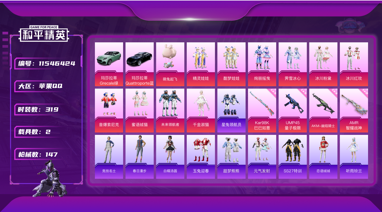 [11546424]10粉装 4特效枪 2载具 6印记 可二次 可修改实名 优质装备:玛莎拉蒂Grecale(薄荷绿),玛莎拉蒂Quattroporte(夜幕蓝),UMP45量子极限,未来领航者,AKM-幽焰骑士,千金淑猫,AMR-智耀战神,Kar98K-巳巳如意 时装数:319 枪械数:147 战备数:2 热门装扮:精灵娃娃,酣梦娃娃,绚丽摇曳,霁雪冰心,冰川粉黛,冰川红玫,音爆索尼克,蜜语绒猫,星兔领航员 载具:僚机-萌兔起飞 五级特效枪:五级UMP45-量子极限,五级Kar98K-巳巳如意 三级特效枪:三级AKM-幽焰骑士 二级特效枪:二级AMR-智耀战神 紫色装扮:粉日山川,小熊娃娃,雏菊兔兔,萝兰蝴蝶,SS29特训,湖畔霞光,星途旅人,SS28特训,听雨铃兰,鱼渊荷华,玉兔迎春,燕燕于飞,都市丽猫,青团波波,糖糖葫芦,棉花软糖,竞技名士,摩登魅猫,街头风暴,裁决天象,黑曜寓言,甜梦熊熊,元气发射,SS27特训,晶灵使者,春日漫步,蓝冰羽,紫幽梦,SS32特训服(SS32特训套装),白糯汤圆,晨曦轻云,糖霜甜心,恋语绒绒 优质战备:绮梦流光降落伞,曦光华影飞行器,深渊漩涡飞行器,金丰海韵降落伞,橘柚倾心降落伞,千金淑猫降落伞,信仰神谕降落伞,信仰神谕飞行器,牡丹亭·游园飞行器,智耀战神降落伞,冰川粉黛降落伞,甜蜜草莓降落伞,海螺星光降落伞,全功率超战飞行器,启明星降落伞,圣光天使降落伞,飒粉甜心降落伞,梦幻火箭降落伞,甜蜜誓约降落伞,甜心娃娃降落伞,暗星紫秘降落伞 二级优质战备:二级信仰神谕飞行器