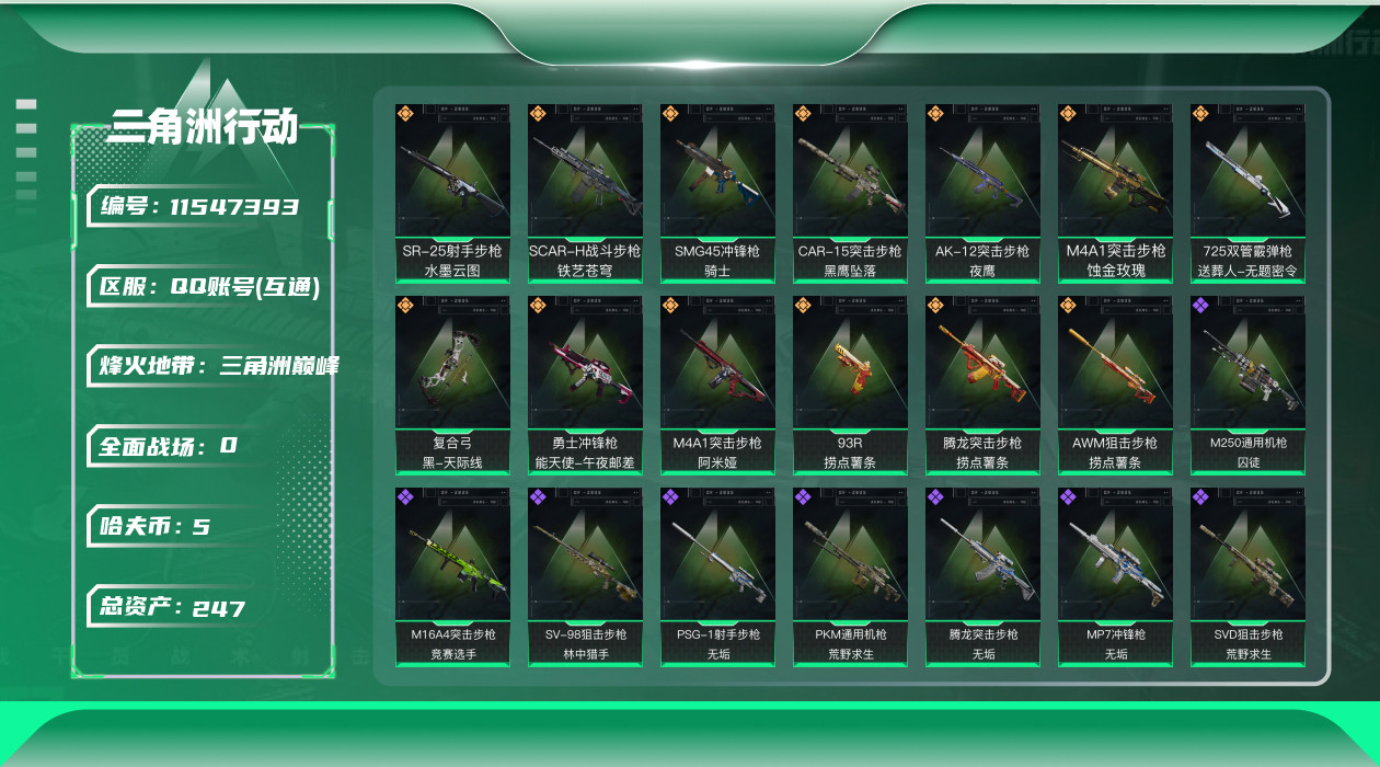 [11547393]总资产:247.4M 3干员外观 13传说枪械 哈夫币:5.187K 高级安全箱(9.17到期) 可二次 可修改实名 烽火地带段位:三角洲巅峰 全面战场段位:军士长 传说武器皮肤:SR-25射手步枪-水墨云图,SCAR-H战斗步枪-铁艺苍穹,AK-12突击步枪-夜鹰,SMG45冲锋枪-骑士,M4A1突击步枪-阿米娅,复合弓-黑-天际线,AWM狙击步枪-捞点薯条,腾龙突击步枪-捞点薯条,93R-捞点薯条,勇士冲锋枪-能天使-午夜邮差,725双管霰弹枪-送葬人-无题密令,M4A1突击步枪-蚀金玫瑰,CAR-15突击步枪-黑鹰坠落 史诗武器皮肤:PKM通用机枪-荒野求生,M16A4突击步枪-竞赛选手,SVD狙击步枪-荒野求生,SV-98狙击步枪-林中猎手,PSG-1射手步枪-无垢,M250通用机枪-囚徒,腾龙突击步枪-无垢,MP7冲锋枪-无垢 干员外观:红狼-蚀金玫瑰,威龙-壮志凌云,蜂医-送葬人·无题密令(S5)