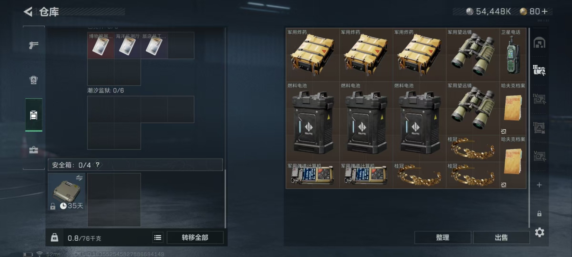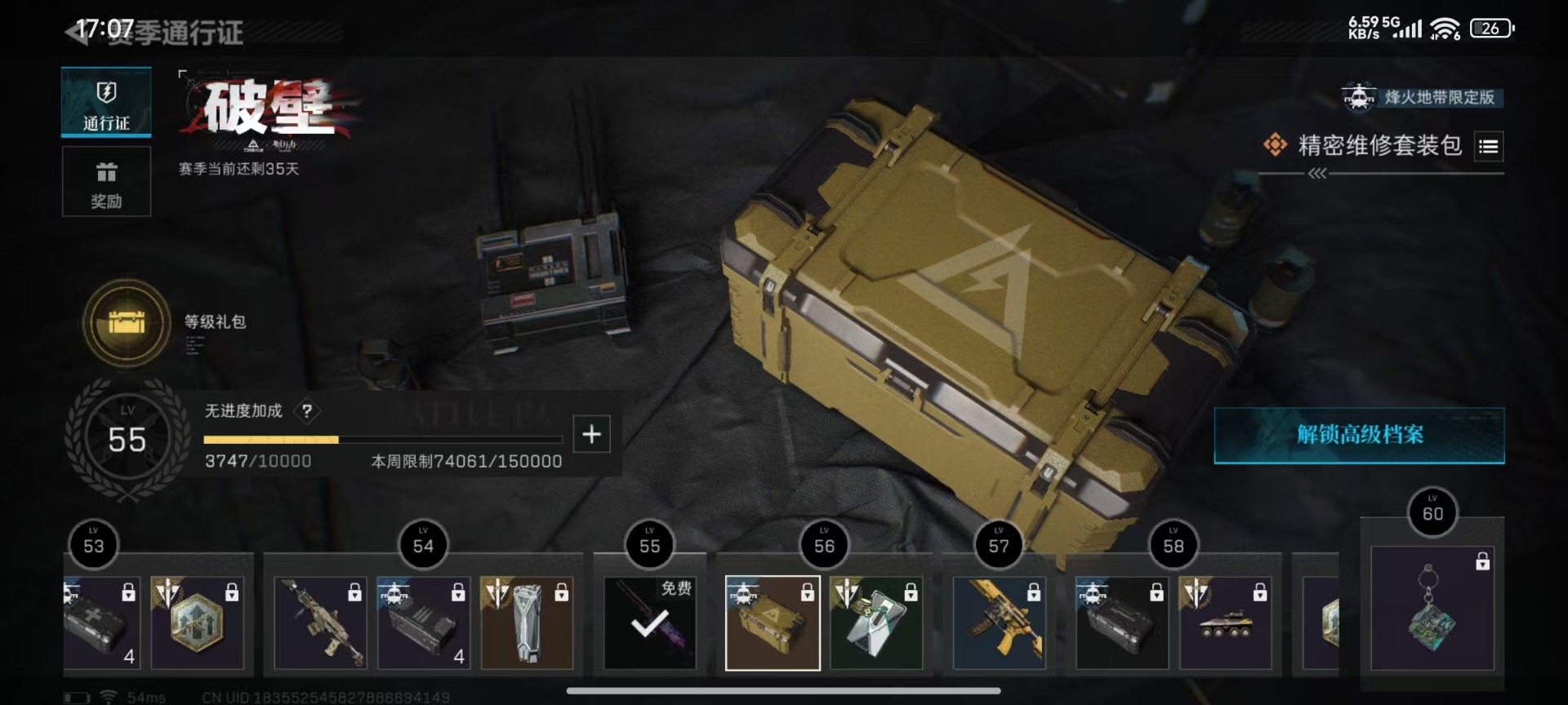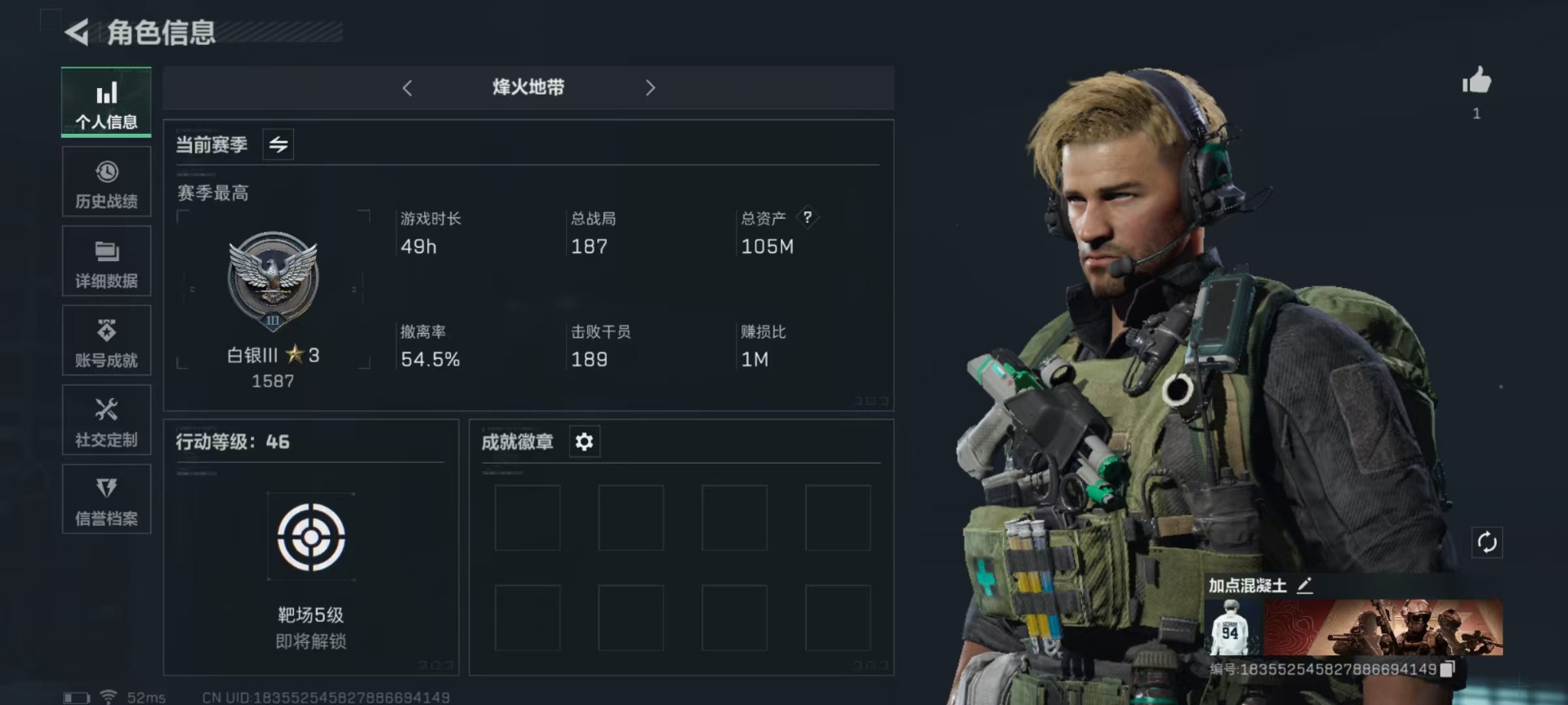 [11547447]总资产:105 2传说枪械 进阶安全箱(2×2)9.15号到期 可二次 可修改实名 烽火地带段位:白银 全面战场段位:无段位 哈夫币:54.448 传说武器皮肤:复合弓-黑-天际线,CAR-15突击步枪-阿米娅 史诗武器皮肤:SV-98狙击步枪-林中猎手,SV-98狙击步枪-囚徒