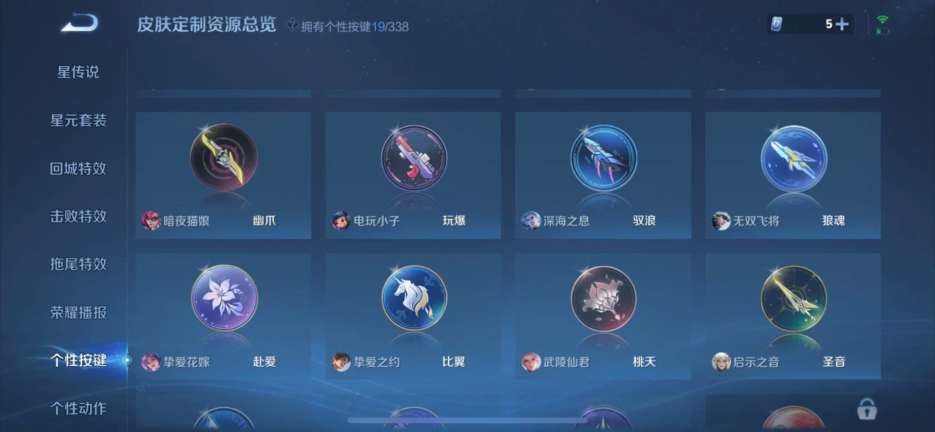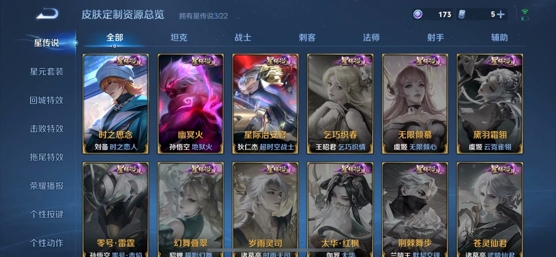 夏侯惇匿光决锋者,甄姬女儿国国王,曹操天狼征服者,伽罗太华,苏烈玄武志,赵云百木心枪,孙膑寅虎·展翼,孙尚香异界灵契,鲁班七号寅虎·瑞焰,露娜启示之音,后羿辉光之辰,公孙离玉兔公主,裴擒虎李小龙,上官婉儿梁祝,花木兰瑞麟志,花木兰青春决赛季,马可波罗逐梦之星,马可波罗山海·玄木吟,马可波罗深海之息,桑启鸣野蒿,猪八戒猪悟能,女娲补天,孙悟空孙行者,孙悟空大圣娶亲,云中君时之祈愿,韩信傲雪梅枪,韩信逐梦之影,百里守约朱雀志,瑶时之祈愿,澜愿照·九州拓
