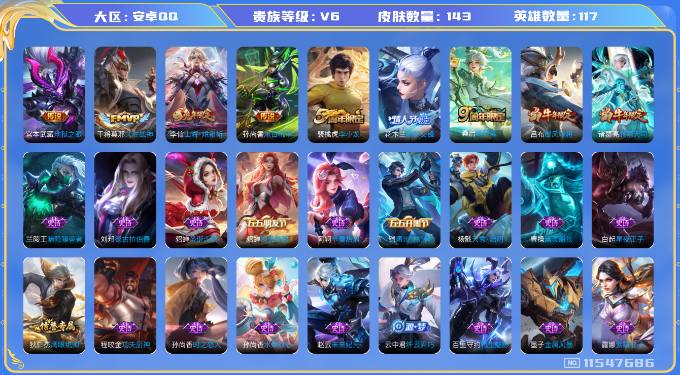 [11547686]V6 6传说 117英雄 143皮肤 可修改实名 优质装备:久胜战神,末日机甲-孙尚香(绿蚂蚱),地狱之眼,山海·炽霜斩(李信年限) 珍宝阁皮:蔷薇恋人 限定皮:鸣野蒿,时雨天司(水龙头),御风骁将(吕布年限),李小龙,默契交锋-花木兰 史诗皮:紫霞仙子,特工魅影,时之恋人-孙尚香,节奏热浪,修罗,水果甜心,星夜王子,功夫厨神,德古拉伯爵,暗隐猎兽者,幽灵船长,天秀·启明,纤云弄巧,曙光守护者,唤灵魅影,金属风暴,圣诞恋歌,鹰眼统帅,赏金猎手,无心,未来纪元-赵云