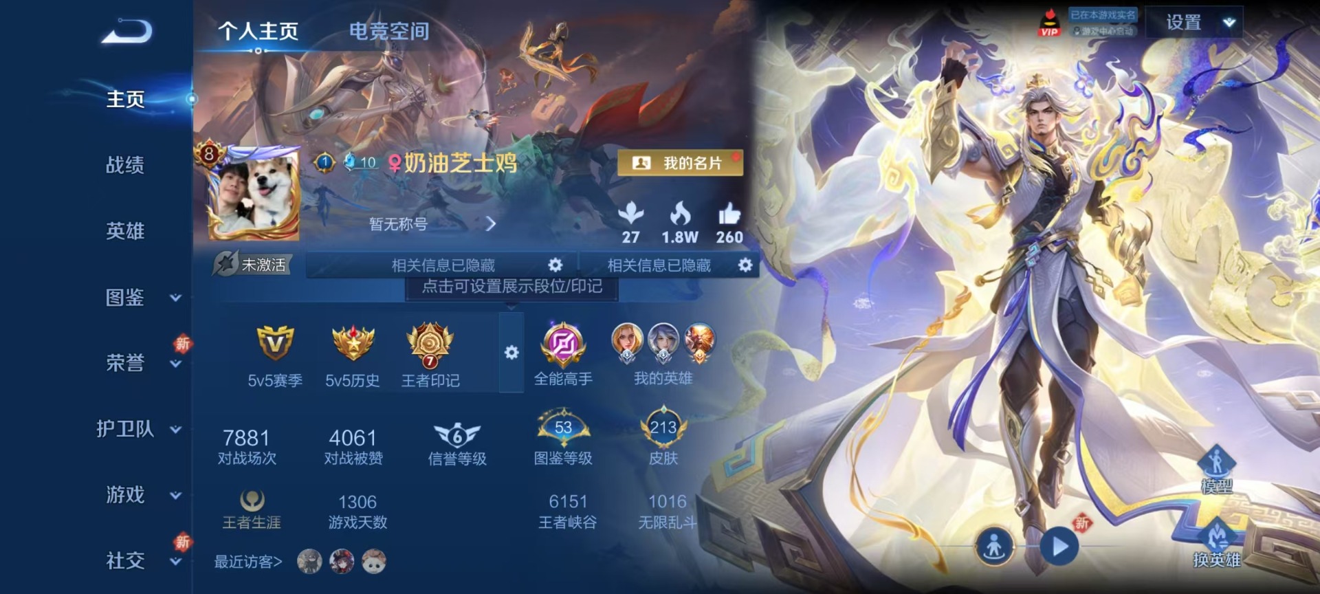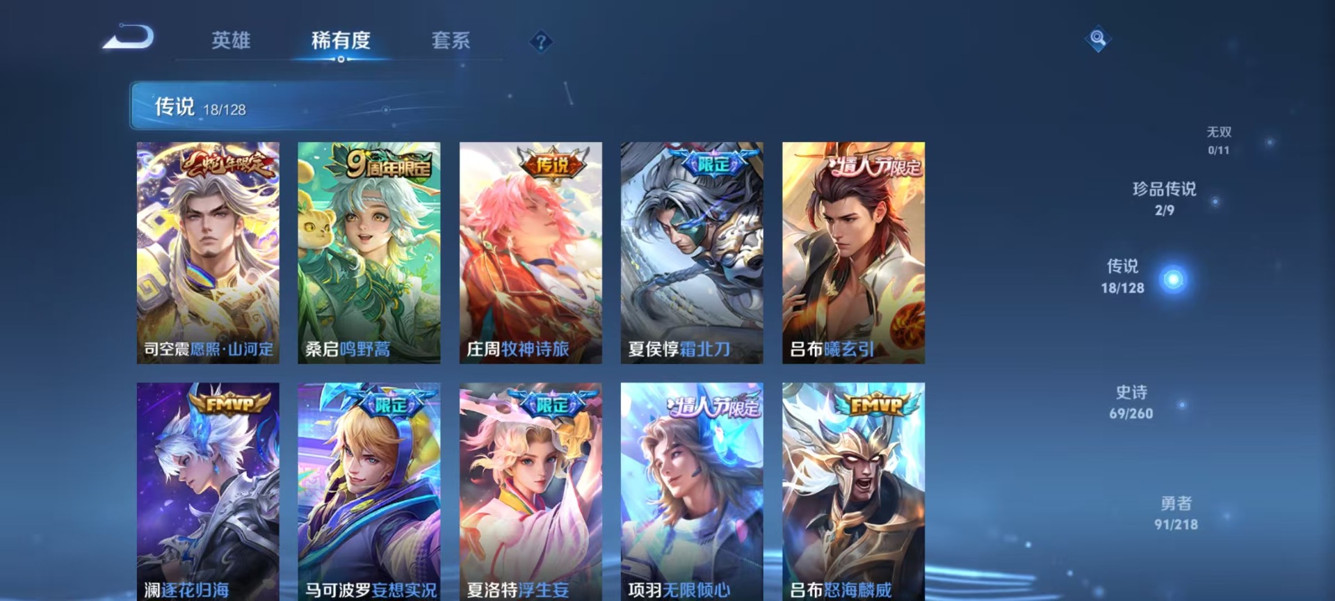 - [11553736]V8 1典藏 12传说 125英雄 271皮肤 可修改实名 优质装备:鸣剑·曳影,云鹰飞将(小将军),一念神魔,末日机甲-孙尚香(绿蚂蚱),时之恋人-刘备(电焊工),无双飞将,碎云,山海·苍雷引(电光曜子),鹤羽星尊 传说皮:幻光神枪 珍宝阁皮:优雅恋人,玩趣恶龙 限定皮:愿照·九州拓(澜年限),鸣野蒿,魔法小厨娘,五谷丰年,梁祝,孙行者,神器·万象笔,山海·玄木吟(马可年限) 史诗皮:化蝶舞,龙之律动,百相守梦-周瑜,茶境仙,埋骨钱,上官婉儿群星魔术团,蔬乡物语(鲁班七号),百相守梦-黄忠,紫霞仙子,黄金分割率,特工魅影,永昼,百相守梦(刘备),江河有灵,蒙恬荣光圣徽,魅语,晚萤,冰冠公主,末日机甲-吕布,猫狗日记-孙策,猫狗日记-大乔,节奏热浪,女仆咖啡,摇滚巨星,水果甜心,绅士熊喵,天才门将,星夜王子,心灵骇客,时之奇旅-安琪拉,功夫厨神,德古拉伯爵,暗隐猎兽者,幽灵船长,鬼剑武藏,暗渊魔法,心灵战警,舞动绿茵,地狱岩魂,纤云弄巧,缤纷独角兽,乘风破浪,逐浪之夏,月团寄思,水晶猎龙者,曙光守护者,唤灵魅影,金属风暴,原初追逐者,圣诞狂欢,鹰眼统帅,魅力维加斯,黎明之约,赏金猎手,无心,未来纪元-赵云