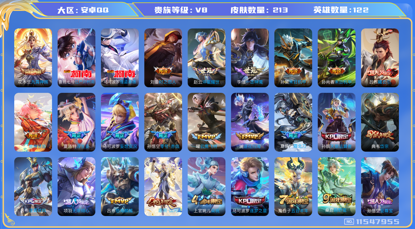 [11547955]V8 1典藏 2珍品传说 18传说 122英雄 213皮肤 可修改实名 女号 优质装备:九霄神辉(木兰典藏),江户川柯南,怪盗基德,云鹰飞将(小将军),一念神魔,末日机甲-孙尚香(绿蚂蚱),零号·赤焰,时之恋人-刘备(电焊工),淬星耀世,末日机甲-孙策,浮生妄,妄想实况,澜逐花归海,牧神诗旅 传说皮:吕布曦玄引 珍宝阁皮:胡桃夹子 限定皮:愿照·山河定(司空震年限),逐霄战戟,鸣野蒿,夏侯惇霜北刀,至尊宝,傲雪梅枪,无限倾心-项羽,怒海麟威,五谷丰年,天狼运算者,梁祝,逐梦之星,岱宗(典韦年限) 史诗皮:星界战将,炽弈燎原,破空之剑,蒙犽顽岩魄,琥珀纪元伽罗,蔬乡物语(鲁班七号),百相守梦-百里守约,星界特工,紫霞仙子,电玩小子(小书包),白龙吟,黄金分割率,特工魅影,江河有灵,百解令(蒙犽),高渐离燃音魔法,蒙恬荣光圣徽,冰冠公主,青蛇,偶像歌手,电玩·爆裂旋风,末日机甲-吕布,猫狗日记-孙策,修罗,女仆咖啡,水果甜心,绅士熊喵,天才门将,星夜王子,心灵骇客,功夫厨神,德古拉伯爵,暗隐猎兽者,幽灵船长,鬼剑武藏,心灵战警,乐园奇幻夜,地狱岩魂,纤云弄巧,拒霜思,缤纷独角兽,乘风破浪,逐浪之夏,水晶猎龙者,曙光守护者,金属风暴,圣诞狂欢,圣诞恋歌,鹰眼统帅,魅力维加斯,赏金猎手,未来纪元-赵云