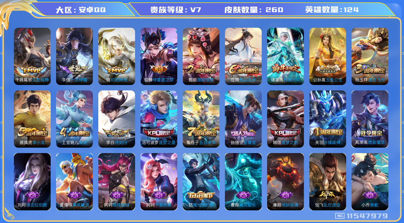 - [12229038]V7 16传说 123英雄 211皮肤 可修改实名 优质装备:黄金狮子座,猫影幻舞,炽阳神光,云霓雀翎,仲夏夜之梦(大飞蛾),记忆之芯(机甲兔),霜月吟,澜逐花归海,琥珀纪元马超 传说皮:貂蝉曦玄引,云诺千山 珍宝阁皮:妄想食味,蔷薇恋人 限定皮:愿照·九州拓(澜年限),愿照·福禄聚(蔡文姬年限),愿照·岁时盈(虞姬年限),愿照·众生和(妲己年限),陌上桑,鸣野蒿,遇见飞天,逐梦之星,逐梦之音,李小龙,朱雀志(守约年限),玉兔公主,山海·玄木吟(马可年限) 史诗皮:鸭鸭历险记-刘禅,器灵·浮梦炉,绮世丹青,化蝶舞,星界战将,龙之律动,雪豹·霜爪,茶境仙,蒙犽顽岩魄,琥珀纪元伽罗,紫霞仙子,苍穹之光,电玩小子(小书包),特工魅影,江河有灵,魅语,百解令(蒙犽),高渐离燃音魔法,蒙恬荣光圣徽,无限星赏官,偶像歌手,电玩·爆裂旋风,暗夜猫娘,末日机甲-吕布,猫狗日记-孙策,时之恋人-孙尚香,乱世虎臣,节奏热浪,修罗,女仆咖啡,水果甜心,心灵骇客,鬼剑武藏,天秀·启明,地狱岩魂,繁星吟游(呼啦呼啦),缤纷独角兽,乘风破浪,逐浪之夏,水晶猎龙者,唤灵魅影,金属风暴,圣诞狂欢,圣诞恋歌,鹰眼统帅,魅力维加斯,黎明之约,未来纪元-赵云