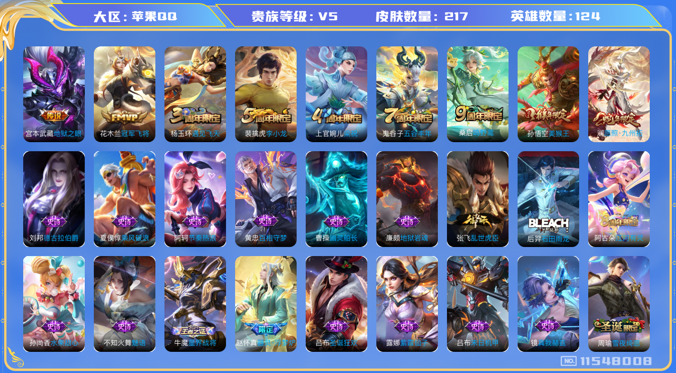 [11548008]V5 4传说 124英雄 217皮肤 可修改实名 优质装备:冠军飞将,地狱之眼,涂山容容 珍宝阁皮:万物之道,蔷薇恋人,玩趣恶龙 限定皮:愿照·九州拓(澜年限),鸣野蒿,遇见飞天,五谷丰年,梁祝,李小龙,美猴王 史诗皮:器灵·浮梦炉,星界战将,石田雨龙,破空之剑,蒙犽顽岩魄,百相守梦-黄忠,紫霞仙子,特工魅影,江河有灵,雪夜绮愿(周瑜),真我赫兹(镜),魅语,蒙恬荣光圣徽,冰冠公主,晚萤,电玩·爆裂旋风,末日机甲-吕布,乱世虎臣,节奏热浪,摇滚巨星,水果甜心,天才门将,星夜王子,功夫厨神,德古拉伯爵,暗隐猎兽者,幽灵船长,鬼剑武藏,心灵战警,舞动绿茵,地狱岩魂,纤云弄巧,繁星吟游(呼啦呼啦),乘风破浪,逐浪之夏,水晶猎龙者,金属风暴,原初追逐者,圣诞狂欢,圣诞恋歌,鹰眼统帅,暗夜贵公子,魅力维加斯,黎明之约,未来纪元-赵云