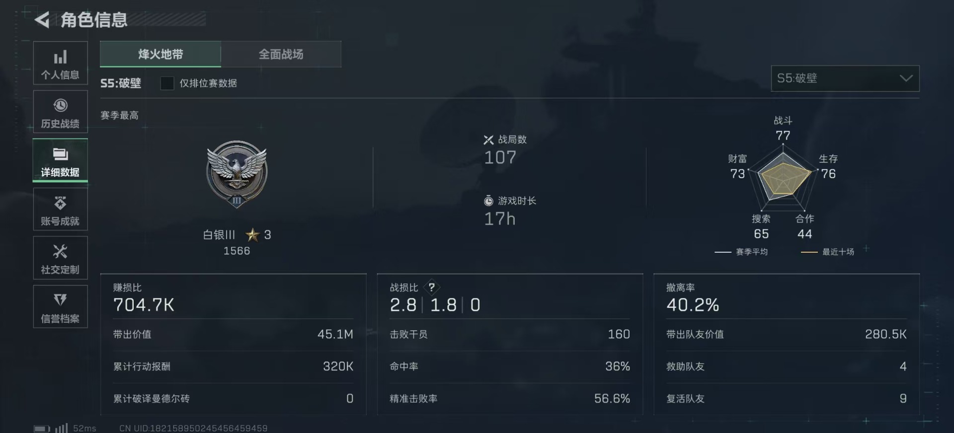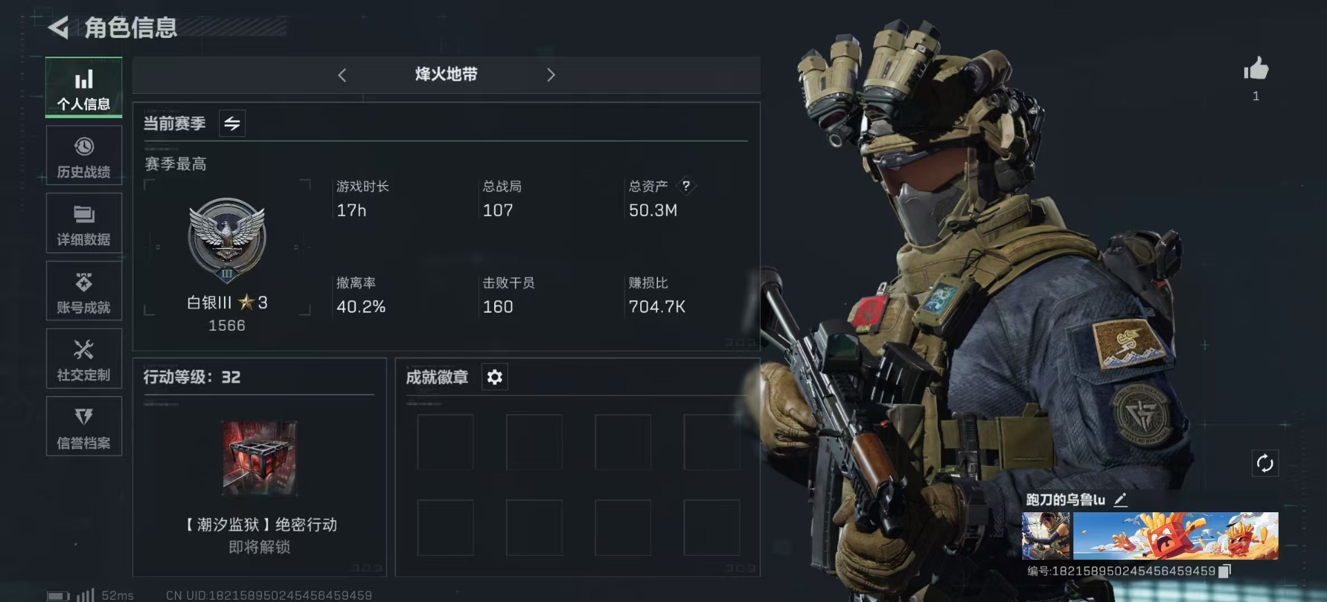 [11548039]总资产:50.3M 5传说枪械 哈夫币:27.226K 可二次 可修改实名 烽火地带段位:白银 全面战场段位:无段位 传说武器皮肤:AWM狙击步枪-捞点薯条,腾龙突击步枪-捞点薯条,93R-捞点薯条,勇士冲锋枪-能天使-午夜邮差,M4A1突击步枪-阿米娅 史诗武器皮肤:QJB201轻机枪-Old Habits,SV-98狙击步枪-林中猎手