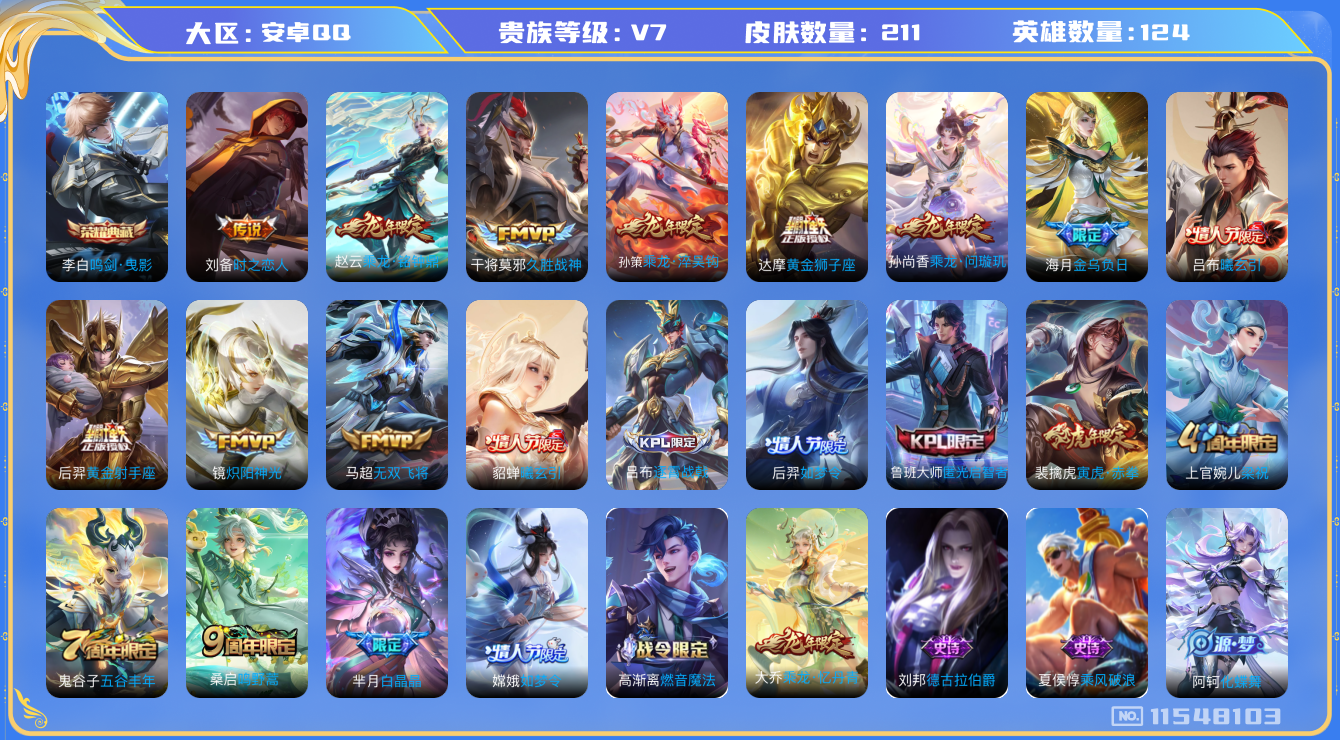 [11548103]V7 1典藏 14传说 124英雄 211皮肤 可修改实名 优质装备:鸣剑·曳影,黄金狮子座,黄金射手座,久胜战神,炽阳神光,时之恋人-刘备(电焊工),无双飞将,金乌负日,涂山容容 传说皮:乘龙·问璇玑(孙尚香年限),乘龙·铭钟鼎(赵云年限),乘龙·淬吴钩(孙策年限),貂蝉曦玄引,吕布曦玄引 珍宝阁皮:胡桃夹子 限定皮:逐霄战戟,鸣野蒿,白晶晶,五谷丰年,梁祝,如梦令-嫦娥,如梦令-后羿,寅虎·赤拳(老虎年限),匿光启智者 史诗皮:鸭鸭历险记-刘禅,化蝶舞,星界战将,龙之律动,石田雨龙,百相守梦-周瑜,破空之剑,琥珀纪元伽罗,决胜骁骑,超元猎域,乘龙·聚宝船(安琪拉年限),乘龙·忆丹青(大乔年限),百相守梦-百里守约,百相守梦-黄忠,织梦人,遇见神鹿,紫霞仙子,黄金分割率,特工魅影,千年之狐,永昼,江河有灵,真我赫兹(镜),魅语,高渐离燃音魔法,蒙恬荣光圣徽,无限星赏官,偶像歌手,晚萤,末日机甲-吕布,时之恋人-孙尚香,乱世虎臣,摇滚巨星,水果甜心,星夜王子,心灵骇客,德古拉伯爵,暗隐猎兽者,幽灵船长,鬼剑武藏,暗渊魔法,天秀·启明,舞动绿茵,地狱岩魂,诗语江南,纤云弄巧,缤纷独角兽,乘风破浪,逐浪之夏,水晶猎龙者,曙光守护者,箭羽风息,原初追逐者,鹰眼统帅,魅力维加斯,未来纪元-赵云