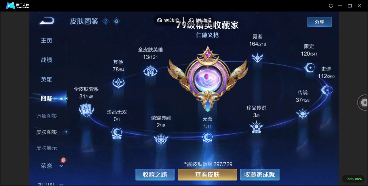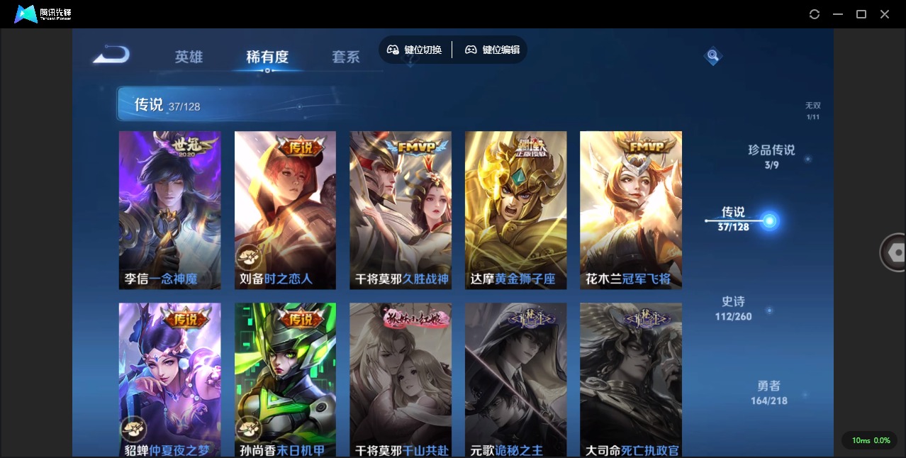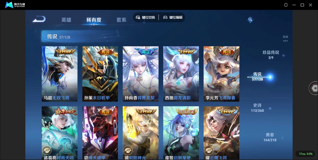 - PX_2090860-98 安卓QQ/至尊星耀/213皮肤/124英雄/1典藏/0珍品无双/0无双/0珍品传说/13传说/54史诗/8稀有英雄 【1 典藏皮肤】九霄神辉 花木兰, 【13 传说皮肤】鹤归松栖 云缨,云霓雀翎 虞姬,李逍遥 曜,齐天大圣 孙悟空,仲夏夜之梦 貂蝉,炽阳神光 镜,久胜战神 干将莫邪,异界灵契 孙尚香,末日机甲 孙策,一念神魔 李信,妄想实况 马可波罗,愿照·千秋盛 女