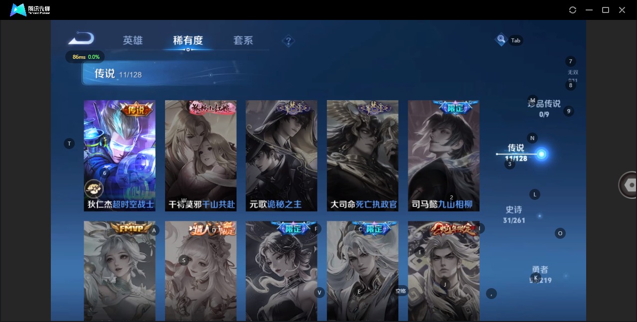 - PX_2111833-Q/至尊星耀/172皮肤/124英雄/2典藏/0珍品无双/0无双/3珍品传说/14传说/47史诗/8稀有英雄 【3 珍品传说】朽木白哉 暃,黑崎一护 宫本武藏,怪盗基德 马可波罗, 【2 典藏皮肤】鸣剑·曳影 李白,杀手不太冷 孙尚香, 【14 传说皮肤】启明星使 虞姬,逐花归海 澜,白虎志 百里玄策,零号·赤焰 孙悟空,黄金射手座 后羿,时之恋人 刘备,黄金狮子座 达摩,战
