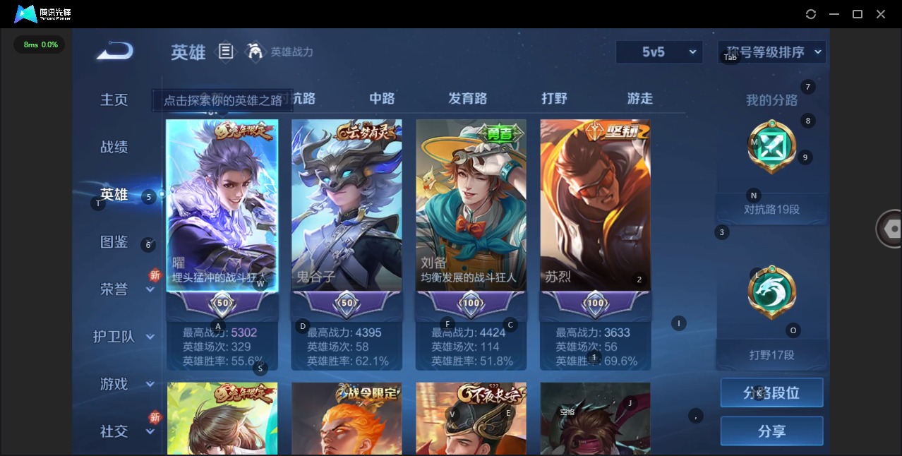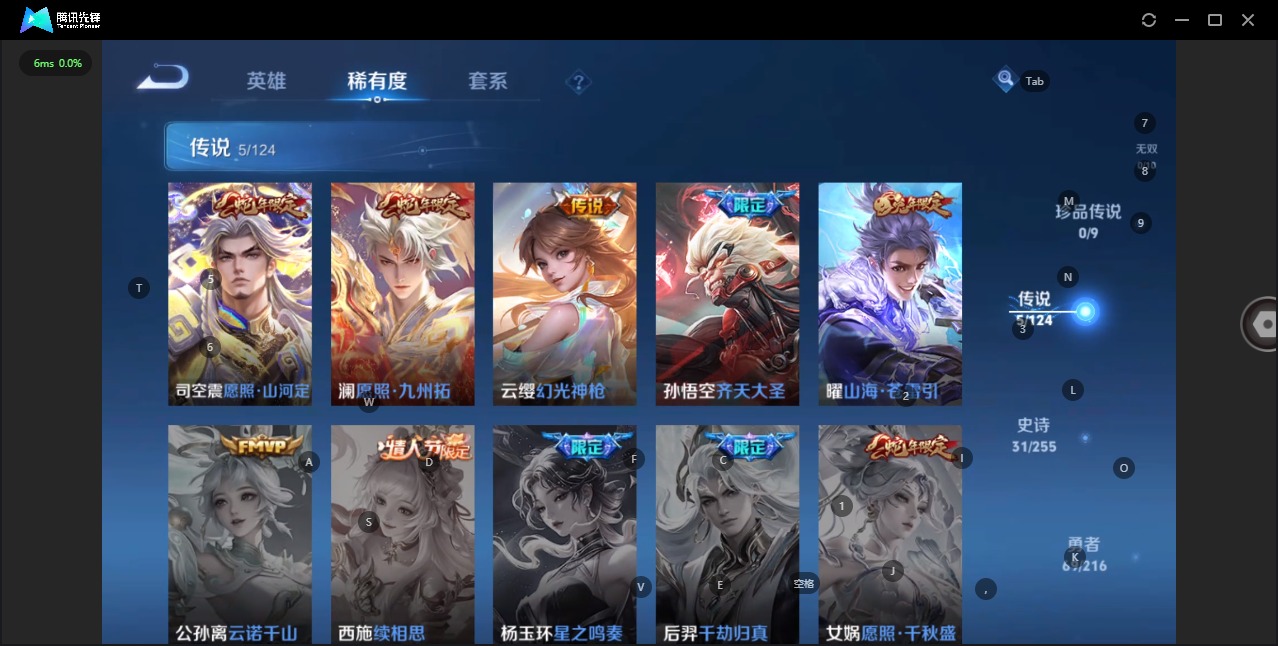 - PX_2081919-贵族等级: V6 英雄数: 122 皮肤数: 190 传说皮: 淬星耀世,灼幽烈阳,琥珀纪元铠 限定皮: 遇见飞天,李小龙,奔雷神使,梁祝,高山流水,猪悟能,五谷丰年