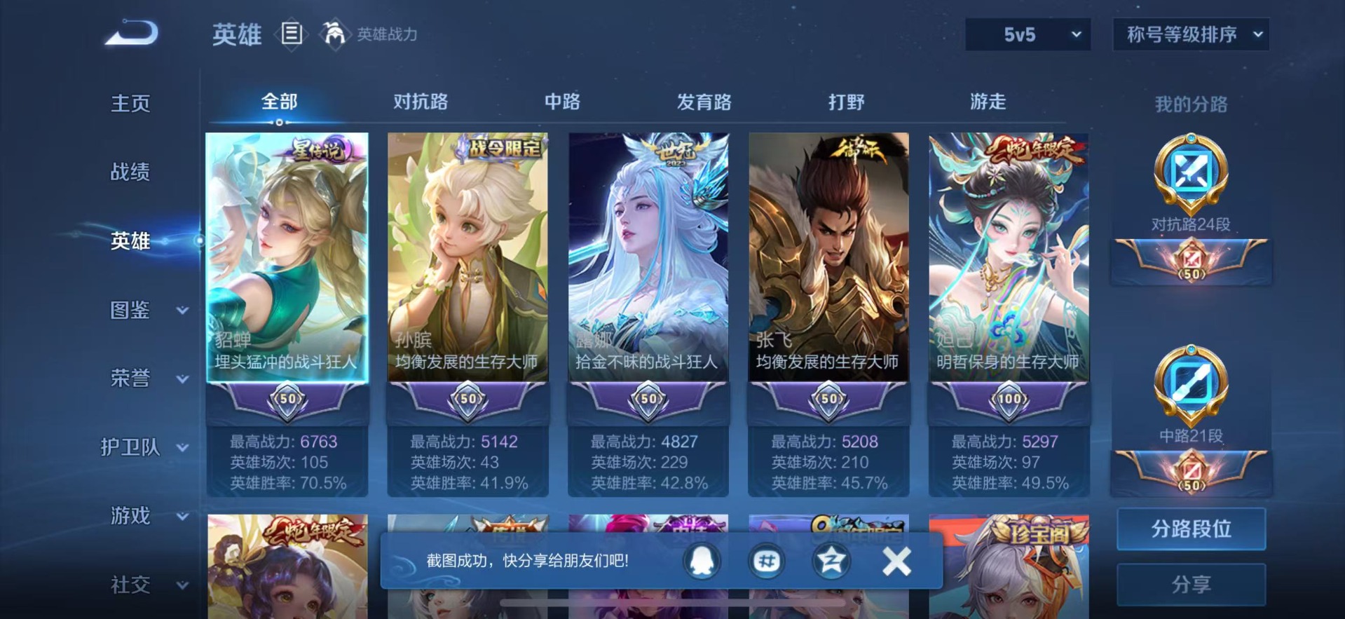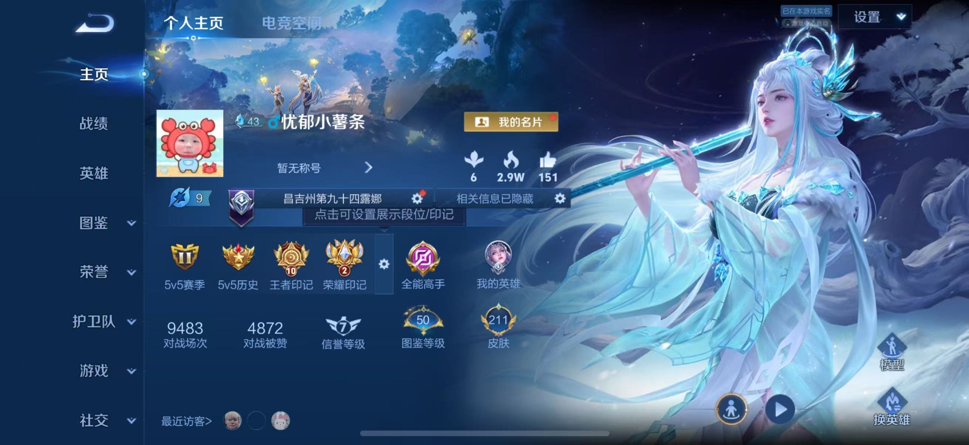 - [11603395]V7 2典藏 4传说 124英雄 246皮肤 可修改实名 安全保护中 荣耀水晶:最初的交响(伽罗典藏),幻阙歌(貂蝉典藏) 传说皮:仲夏夜之梦(大飞蛾),地狱之眼,神器·狴犴令,妄想实况 珍宝阁皮:优雅恋人,玩趣恶龙 限定皮:高山流水,五谷丰年,李小龙,神器·万象笔 史诗皮:茶境仙,器灵·浮梦炉,化蝶舞,蔬乡物语(鲁班七号),紫霞仙子,苍穹之光,特工魅影,千年之狐,永昼,电玩·爆裂旋风,电玩·兔顽号,冰冠公主,江河有灵,蒙恬荣光圣徽,偶像歌手,暗夜猫娘,龙骑士(小龙虾),乱世虎臣,节奏热浪,修罗,女仆咖啡,摇滚巨星,水果甜心,绅士熊喵,天才门将,星夜王子,功夫厨神,德古拉伯爵,暗隐猎兽者,幽灵船长,鬼剑武藏,舞动绿茵,地狱岩魂,缤纷独角兽,乘风破浪,逐浪之夏,水晶猎龙者,箭羽风息,唤灵魅影,金属风暴,原初追逐者,圣诞狂欢,圣诞恋歌,鹰眼统帅,魅力维加斯,黎明之约,赏金猎手,奇遇舞章,无心,未来纪元-赵云