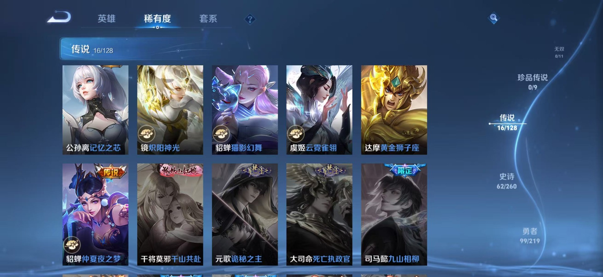 - [11470601]夏侯惇机甲,武则天,牛年限定全,久胜,小将军,电光耗子,仲夏夜,至尊宝,-可二次-122英雄-260皮肤-1典藏-20传说-75史诗 白虎志-百里玄策 默契交锋-兰陵王 时雨天司-诸葛亮 祈雪灵祝-公孙离 冰锋战神-关羽 奔雷神使-牛魔 至尊宝-孙悟空 街头霸王-韩信
