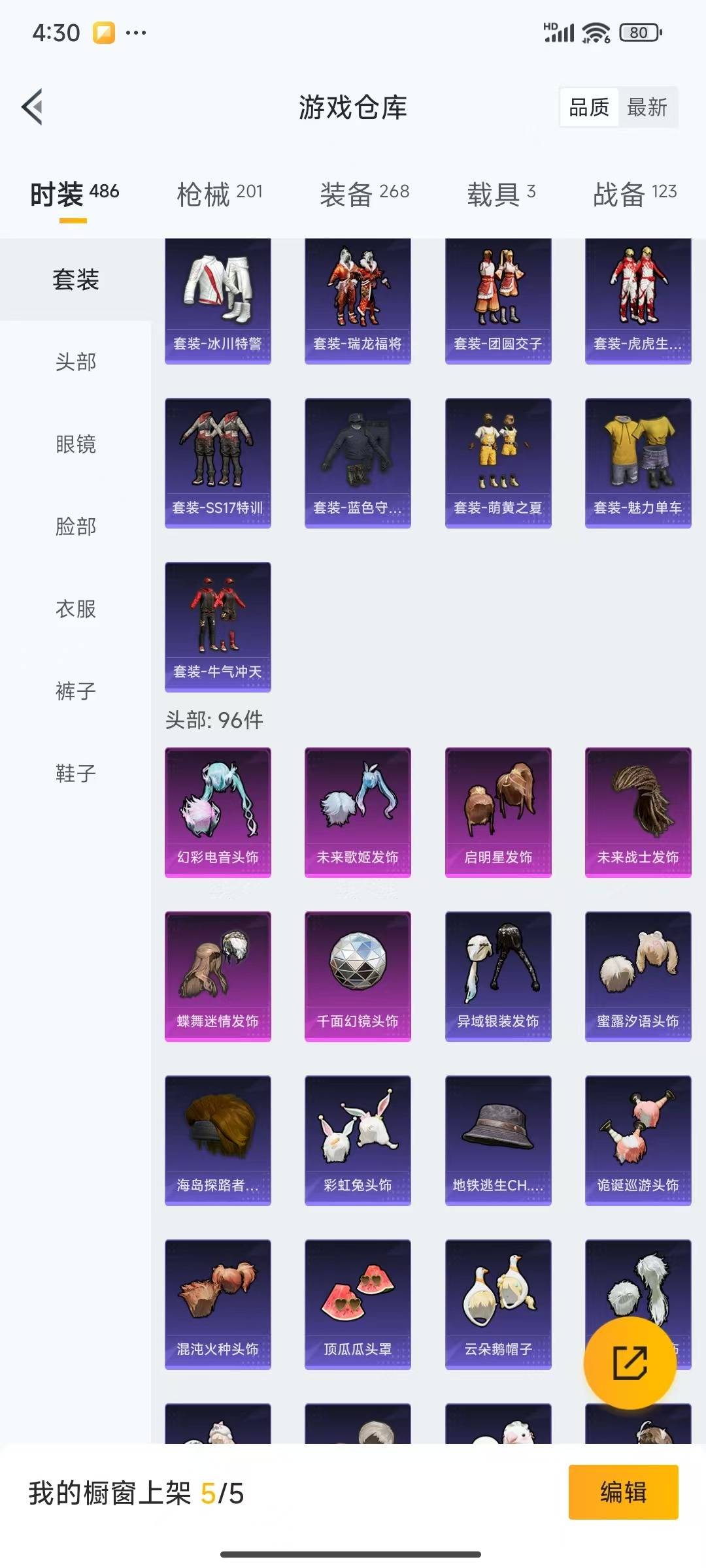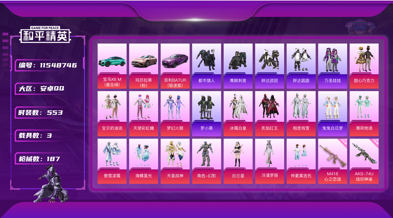 [11548746]15粉装 10特效枪 3载具 11印记 可二次 可修改实名 身法装备:都市猎人,暗影哥特(红眼罩),萌熊伴侣背包(粉熊背包) 优质装备:宝马X6 M(曼岛绿),玛莎拉蒂Ghibli(粉),甜心巧克力,宾利BATUR(极速紫),都市猎人,萌熊伴侣背包(粉熊背包),M416心之恋语,梦幻火箭(新101)(新火箭少女101粉色套装),宝贝奶油派,天使彩虹糖,SCAR-L童趣迷兔,炙焰红王,冰霜白皇,AUG星之彼岸,UMP45相思残雪(UMP45-相思残雪),相思残雪,AKM梦之光华,P90粉樱探戈,AUG超新星,AKS-74U-信仰神谕,冷漠罗丽,Kar98K-巳巳如意 热门装扮:薄荷物语,傲雪凌霜,海螺星光,仲夏莫吉托,天星战神,幻影,白兰星,兔兔白日梦,胖达圆圆,胖达团团,罗小黑,鹰眼刺客,万圣娃娃,都市猎人 稀有枪皮:DP-28-豹影疾电 六级特效枪:六级M416-心之恋语,六级AKS-74U-信仰神谕 五级特效枪:五级SCAR-L-童趣迷兔,五级Kar98K-巳巳如意,五级DP-28-豹影疾电,五级P90-粉樱探戈,五级AUG-超新星,五级UMP45-相思残雪,五级AKM-梦之光华 一级特效枪:一级AUG-星之彼岸 紫色装扮:田园牧歌,轻风白浪,和煦暖阳,SS22特训,SS23特训,幻彩翩翩,妙红点点,摩登艾咪,香榭午后,娇憨猪猪,梦幻奶油,萌趣咩咩,SS21特训,SS31特训套装,冷焰舞者,SS30特训套装,云朵鹅,彩虹兔,雪绒豹,SS33特训套装,青涩时光,顶瓜瓜,时希公主,SS20特训,星梦畅游,微雨春柳,暖风夏荷,猎梦纪元,飞驰魅影,音速流光,SS19特训,甜心亚梦,虚音幻奏,野性山猫,野性战心,长空猛禽,霓虹街区,青年教官,缤纷果语,街头潮人,飞行日记,魅力单车,麻辣教官,黄色名流,黑色伏地魔,龙的传人,龟仙人,香桃花海,沙漠毒蛇,极地朋克,柠萌假日,海岛探路者,涂山之恋,坚韧舞者,夏日倾情,完美偶像,帅气教官,幻世战舞者,探宝勇士,湖蓝色名流,白熊同盟,白色伏地魔,破晓战魂,破蛋小黄鸡,空岛之星,竞技达人朋克,甜蜜熊情侣,王牌教练,牛气冲天,炫蓝之夏,牛气满满,猛禽,猎鹰,SS29特训,星途旅人,SS28特训,异域银装,鱼渊荷华,玉兔迎春,燕燕于飞,巳巳如意,海琴烟,风玲,青团波波,糖糖葫芦,棉花软糖,竞技名士,摩登魅猫,暗影哥特(红眼罩),街头风暴