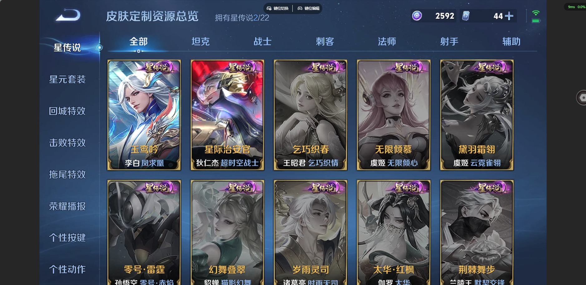 黄忠烈魂,赵云百木心枪,干将莫邪冰霜恋舞曲,小乔纯白花嫁,典韦岱宗,后羿如梦令,庄周玄嵩,公孙离玉兔公主,裴擒虎李小龙,裴擒虎寅虎·赤拳,东皇太一逐梦之光,上官婉儿梁祝,马可波罗逐梦之星,马可波罗山海·玄木吟,桑启鸣野蒿,孙悟空孙行者,孙悟空大圣娶亲,芈月白晶晶,孙悟空至尊宝,孙悟空美猴王,百里玄策白虎志,赵云引擎之心,韩信傲雪梅枪,韩信飞衡,蔡文姬奇迹圣诞,澜愿照·九州拓,虞姬霸王别姬,妲己热情桑巴,嫦娥如梦令,王昭君凤凰于飞,关羽冰锋战神