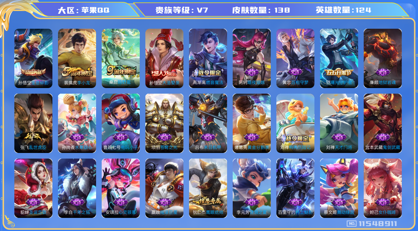 - [12203142]V7 8传说 123英雄 195皮肤 可修改实名 优质装备:黄金狮子座,一念神魔,仲夏夜之梦(大飞蛾),零号·赤焰,山海·炽霜斩(李信年限) 传说皮:幻光神枪 珍宝阁皮:蔷薇恋人 限定皮:鸣野蒿,白晶晶,时雨天司(水龙头),游园惊梦,李小龙,朱雀志(守约年限),默契交锋-花木兰 史诗皮:蔬乡物语(鲁班七号),紫霞仙子,冰冠公主,江河有灵,百解令(蒙犽),魅语,偶像歌手,末日机甲-吕布,猫狗日记-孙策,猫狗日记-大乔,修罗,水果甜心,天才门将,星夜王子,心灵骇客,德古拉伯爵,暗隐猎兽者,幽灵船长,鬼剑武藏,心灵战警,纤云弄巧,缤纷独角兽,乘风破浪,水晶猎龙者,箭羽风息,金属风暴,原初追逐者,圣诞狂欢,圣诞恋歌,鹰眼统帅,魅力维加斯,无心,未来纪元-赵云