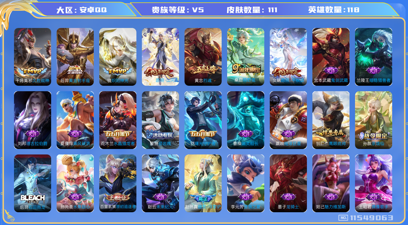 [11549063]V5 6传说 118英雄 111皮肤 可修改实名 优质装备:黄金射手座,久胜战神,炽阳神光 珍宝阁皮:妄想食味 限定皮:愿照·山河定(司空震年限),愿照·千秋盛(女娲年限),鸣野蒿,烈魂 史诗皮:器灵·浮梦炉,石田雨龙,茶境仙,蒙犽顽岩魄,偶像歌手,龙骑士(小龙虾),摇滚巨星,水果甜心,绅士熊喵,德古拉伯爵,暗隐猎兽者,幽灵船长,鬼剑武藏,乘风破浪,逐浪之夏,水晶猎龙者,曙光守护者,原初追逐者,鹰眼统帅,魅力维加斯,未来纪元-赵云