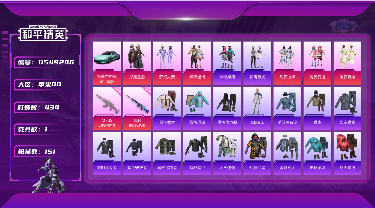 - PX_2113870- 苹果微信-10王牌印记-16粉装-20特效枪-6载具-77250热力值-112套装-205枪皮-2卓越印记-1传奇印记 【16粉装】,梦幻火箭,初号机 觉醒Ver.,宝贝奶油派,小叽联名款,荧海星豚,光极星,憨憨奶龙,狂花道·不知火舞,未来领航者,炫光之旅,大黄蜂,擎天柱,莲影清波,星之彼岸,小蓝,美琪 【20特效枪】AKM-绿萝繁花-5级 AKM-梦之光华-4级 SCAR