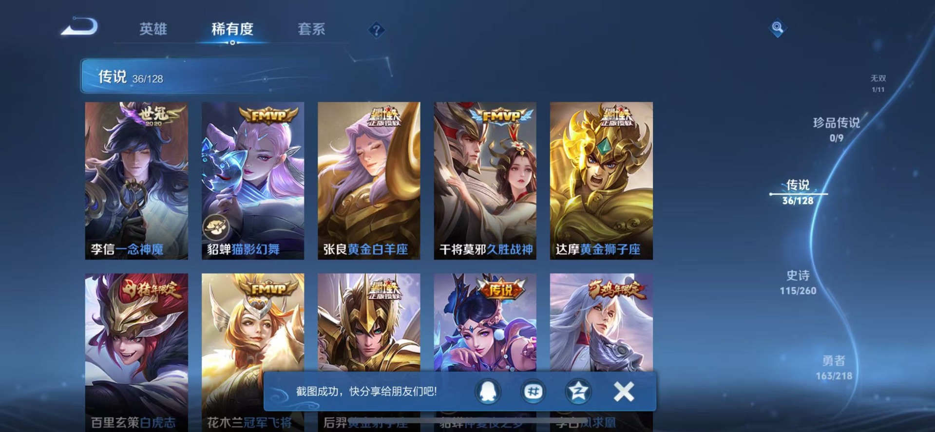 - PX_2110008-Q/非凡王者/258皮肤/122英雄/2典藏/0珍品无双/0无双/0珍品传说/13传说/80史诗/7稀有英雄 【2 典藏皮肤】弑枪猎影 韩信,拾光映像 瑶, 【13 传说皮肤】无双飞将 马超,云鹰飞将 曜,炽阳神光 镜,霜月吟 露娜,黄金狮子座 达摩,一念神魔 李信,淬星耀世 赵云,愿照·九州拓 澜,幻光神枪 云缨,愿照·山河定 司空震,祥瑞亨通 裴擒虎,曦玄引 貂蝉,鸣野蒿
