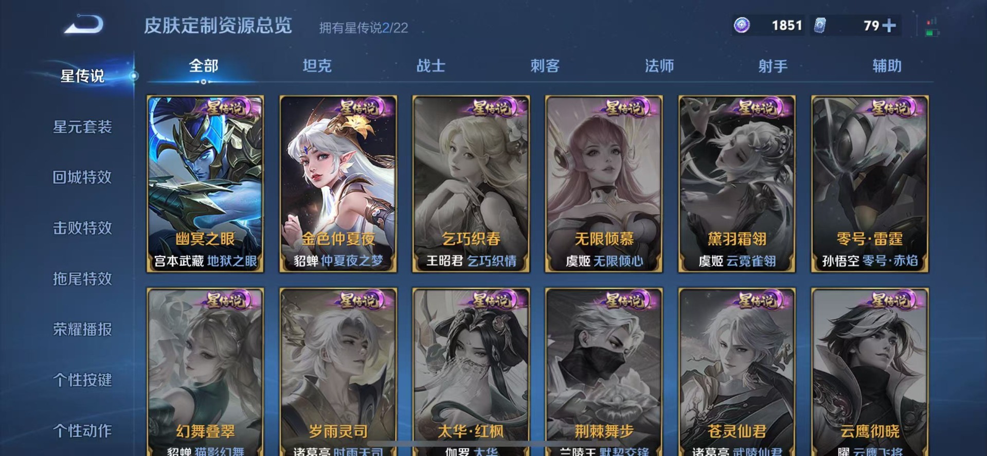 刘邦夺宝奇兵,夏侯惇朔风刀,老夫子醍醐杖,沈梦溪星空之诺,沈梦溪大漠名商,盾山御銮,曹操烛龙,苏烈千军破阵,典韦穷奇,典韦蓝屏警告,达摩沙漠行僧,牛魔御旌,项羽苍威无极,鲁班七号狮舞东方,吕布猎兽之王,镜青焰无极,兰陵王金庭之子,鲁班大师探海日志,明世隐疑决卦,蒙犽狂想玩偶喵,马可波罗暗影游猎,白起狰,鬼谷子原初探秘者,张良古海寻踪,女娲朔望之晖,桑启海盐诗旅,狄仁杰万华元夜,嬴政白昼王子,芈月重明,扁鹊炼金王,李元芳银河之约,李元芳云中旅人,弈星混沌棋,虞姬凯尔特女王,米莱狄御霄,钟馗神迹守卫,狂铁御狮,太乙真人饕餮