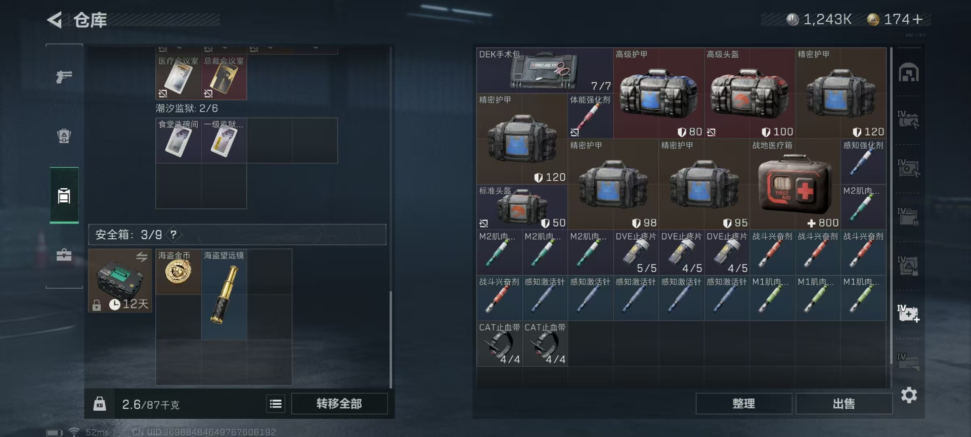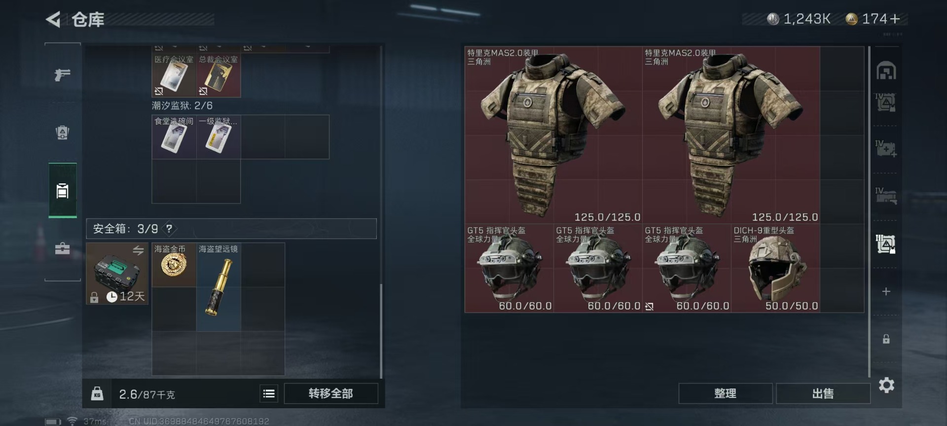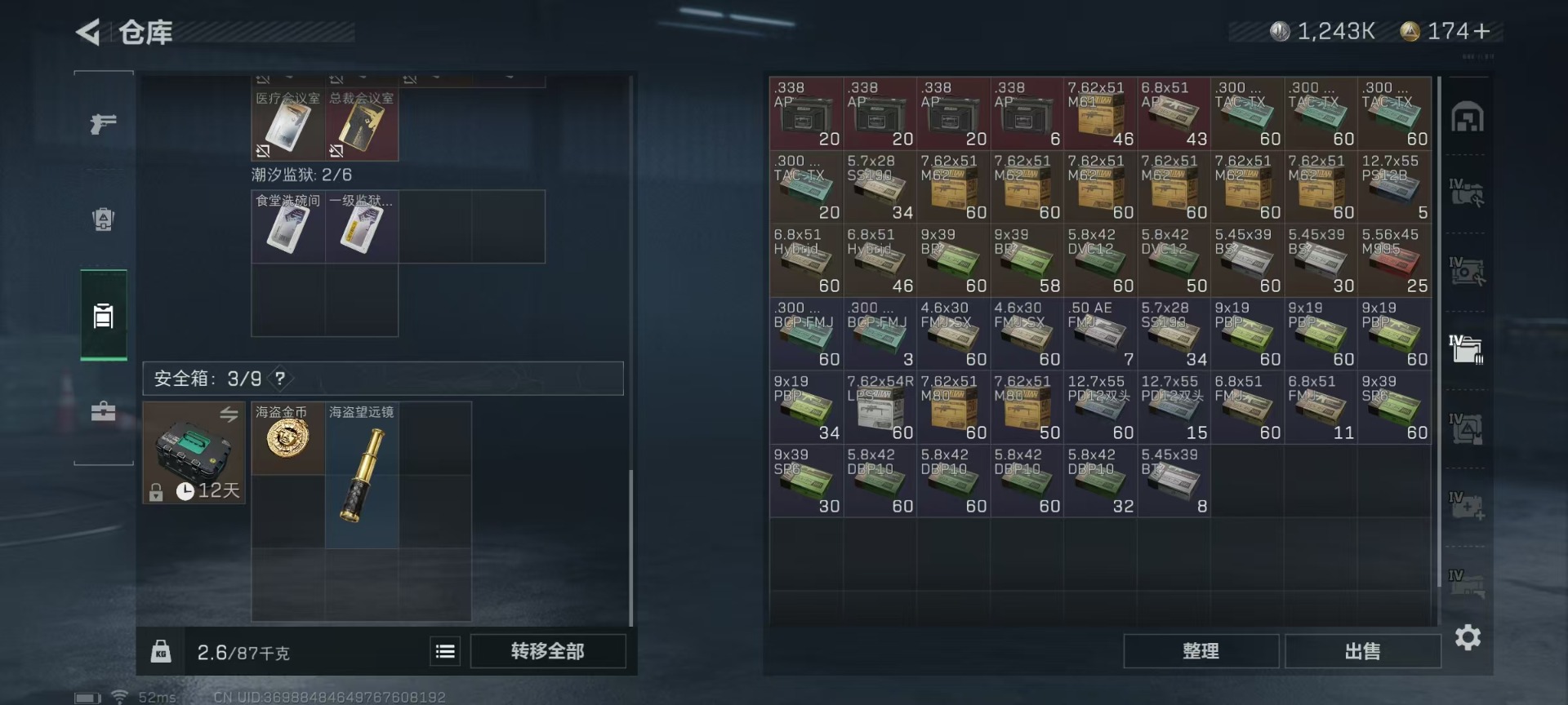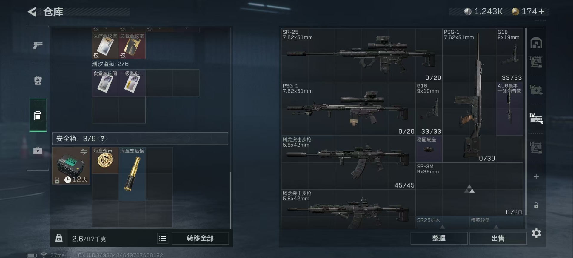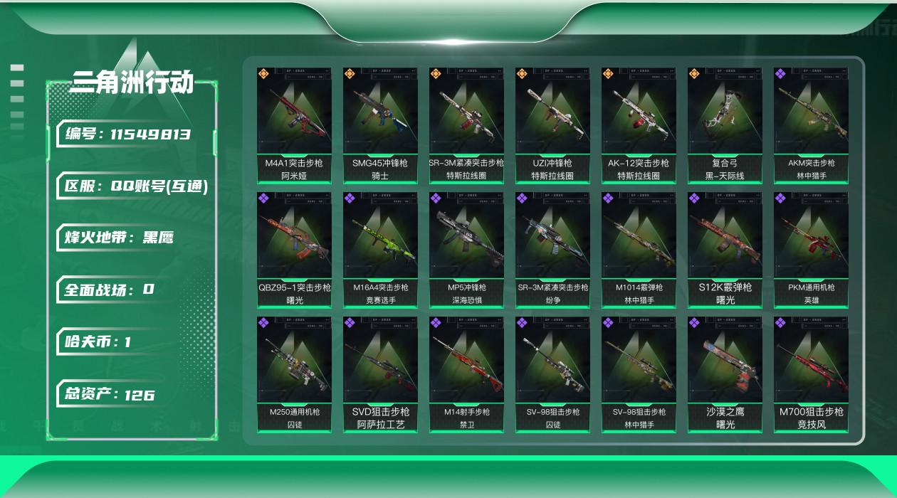 [11549813]总资产:126.6M 6传说枪械 哈夫币:1.243K 顶级安全箱(3×3)9.15号到期 可二次 可修改实名 优质装备:顶级安全箱(3x3) 烽火地带段位:黑鹰 全面战场段位:无段位 传说武器皮肤:SMG45冲锋枪-骑士,UZI冲锋枪-特斯拉线圈,AK-12突击步枪-特斯拉线圈,SR-3M紧凑突击步枪-特斯拉线圈,复合弓-黑-天际线,M4A1突击步枪-阿米娅 史诗武器皮肤:M16A4突击步枪-竞赛选手,M1014霰弹枪-林中猎手,MP5冲锋枪-深海恐惧,AKM突击步枪-林中猎手,SR-3M紧凑突击步枪-纷争,SV-98狙击步枪-林中猎手,M250通用机枪-囚徒,SV-98狙击步枪-囚徒,M14射手步枪-禁卫,QBZ95-1突击步枪-曙光,沙漠之鹰-曙光,SVD狙击步枪-阿萨拉工艺,S12K霰弹枪-曙光,PKM通用机枪-英雄,M700狙击步枪-竞技风