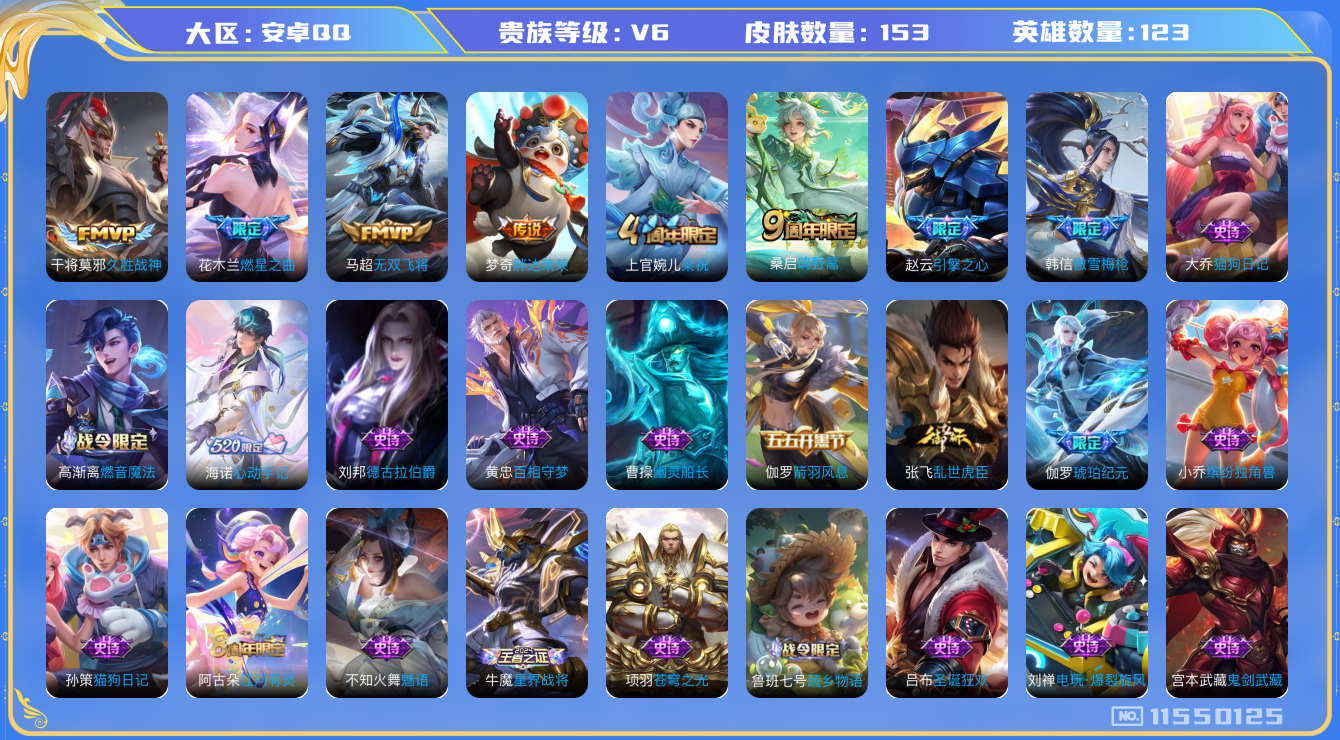 [11550125]V6 5传说 123英雄 153皮肤 可修改实名 优质装备:久胜战神,胖达荣荣,无双飞将,燃星之曲 珍宝阁皮:妄想食味,蔷薇恋人 限定皮:鸣野蒿,傲雪梅枪,梁祝,引擎之心 史诗皮:星界战将,海诺心动手记,琥珀纪元伽罗,决胜骁骑,上官婉儿群星魔术团,蔬乡物语(鲁班七号),百相守梦-黄忠,苍穹之光,特工魅影,千年之狐,永昼,江河有灵,魅语,高渐离燃音魔法,蒙恬荣光圣徽,电玩·爆裂旋风,猫狗日记-孙策,猫狗日记-大乔,乱世虎臣,星夜王子,心灵骇客,德古拉伯爵,暗隐猎兽者,幽灵船长,鬼剑武藏,天秀·启明,纤云弄巧,缤纷独角兽,水晶猎龙者,箭羽风息,原初追逐者,圣诞狂欢,鹰眼统帅,魅力维加斯