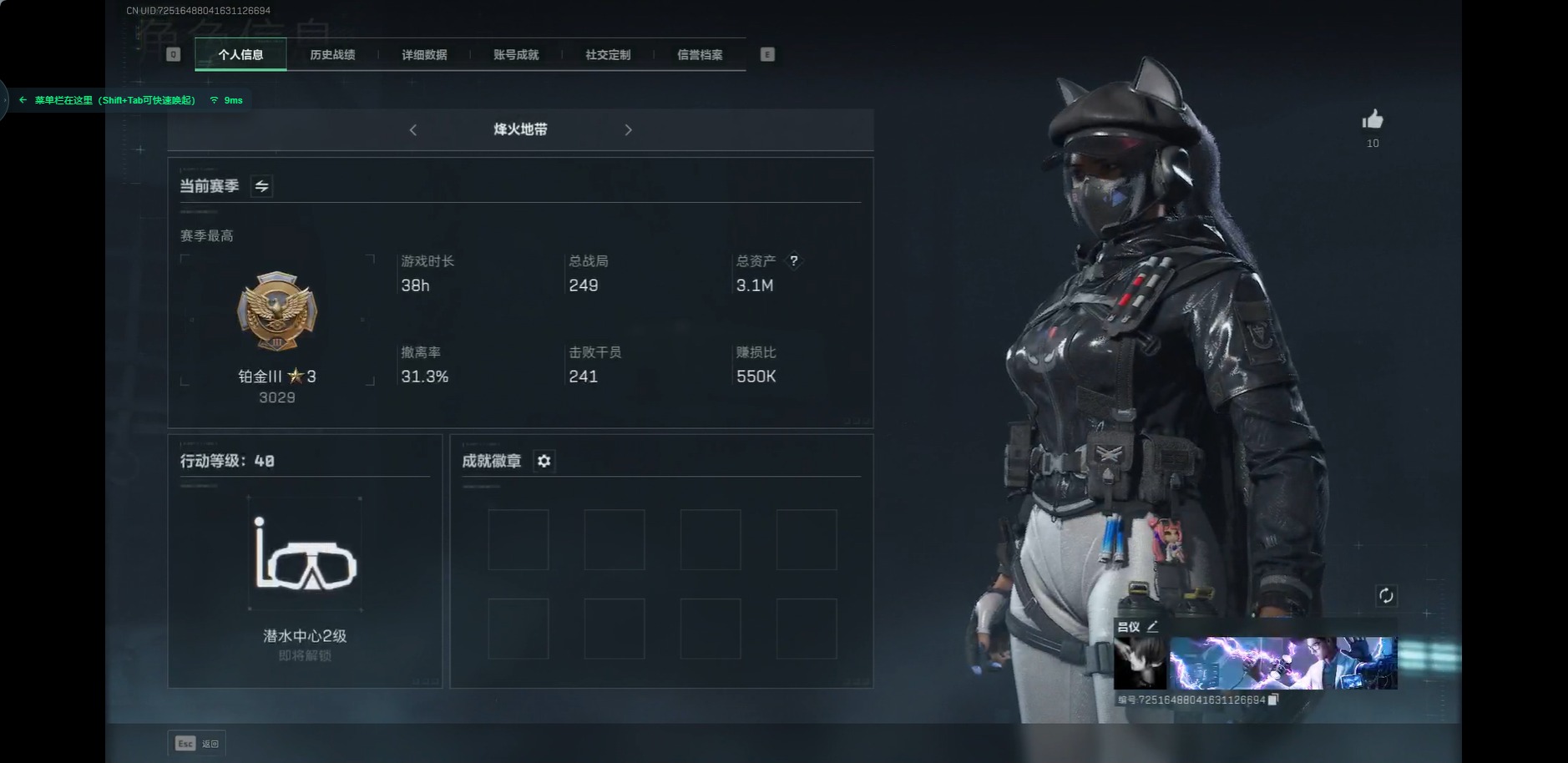 - [12025678]总资产:161.3M 6传说枪械 哈夫币:55.788K 可二次 可修改实名 优质装备:顶级安全箱(3x3) 烽火地带段位:钻石 全面战场段位:尉官 传说武器皮肤:SR-25射手步枪-水墨云图,SMG45冲锋枪-骑士,M4A1突击步枪-阿米娅,CAR-15突击步枪-阿米娅,复合弓-黑-天际线,勇士冲锋枪-能天使-午夜邮差 史诗武器皮肤:Vector冲锋枪-潜袭者,PKM通用机枪-蝮蛇,G3战斗步枪-战场英杰,SVD狙击步枪-暗夜猎手,M16A4突击步枪-竞赛选手,勇士冲锋枪-深海恐惧,M1014霰弹枪-林中猎手,SV-98狙击步枪-林中猎手,PTR-32突击步枪-英雄,M250通用机枪-囚徒,SV-98狙击步枪-囚徒,SCAR-H战斗步枪-囚徒,SVD狙击步枪-阿萨拉工艺,S12K霰弹枪-曙光,QSZ92G-风林火山,93R-博士