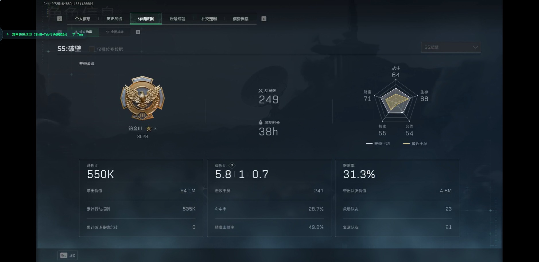 [11550354]总资产:3.1M 1近战传说 15传说枪械 哈夫币:10.161K 高级安全箱(2×3)9.15号到期 可二次 可修改实名 优质装备:近战-北极星,腾龙突击步枪-气象感应(典藏) 烽火地带段位:铂金 全面战场段位:统帅 传说武器皮肤:UZI冲锋枪-特斯拉线圈,M16A4突击步枪-狩猎时刻,AK-12突击步枪-特斯拉线圈,SR-3M紧凑突击步枪-特斯拉线圈,勇士冲锋枪-能天使-午夜邮差,Vector冲锋枪-狩猎时刻,G3战斗步枪-狩猎时刻,复合弓-黑-天际线,K437突击步枪-北极星,QCQ171冲锋枪-北极星,725双管霰弹枪-送葬人-无题密令,M4A1突击步枪-阿米娅,CAR-15突击步枪-阿米娅 史诗武器皮肤:PKM通用机枪-蝮蛇,M16A4突击步枪-竞赛选手,MP5冲锋枪-深海恐惧,SV-98狙击步枪-林中猎手,PKM通用机枪-荒野求生,SCAR-H战斗步枪-囚徒,腾龙突击步枪-无垢,MP7冲锋枪-无垢,PSG-1射手步枪-无垢,SVD狙击步枪-荒野求生,SR-3M紧凑突击步枪-荒野求生