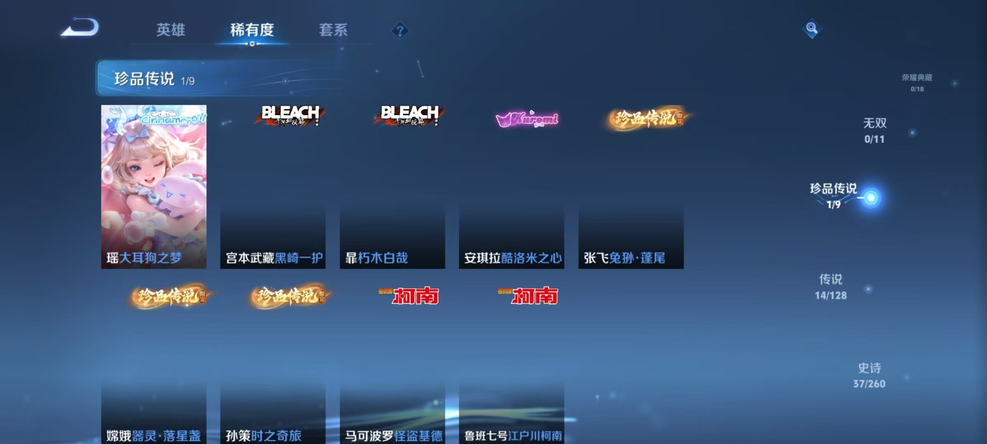 刘邦德古拉伯爵,夏侯惇乘风破浪,铠曙光守护者,小乔缤纷独角兽,露娜紫霞仙子,诸葛亮黄金分割率,兰陵王暗隐猎兽者,貂蝉圣诞恋歌,李白千年之狐,狄仁杰绮世丹青,橘右京修罗