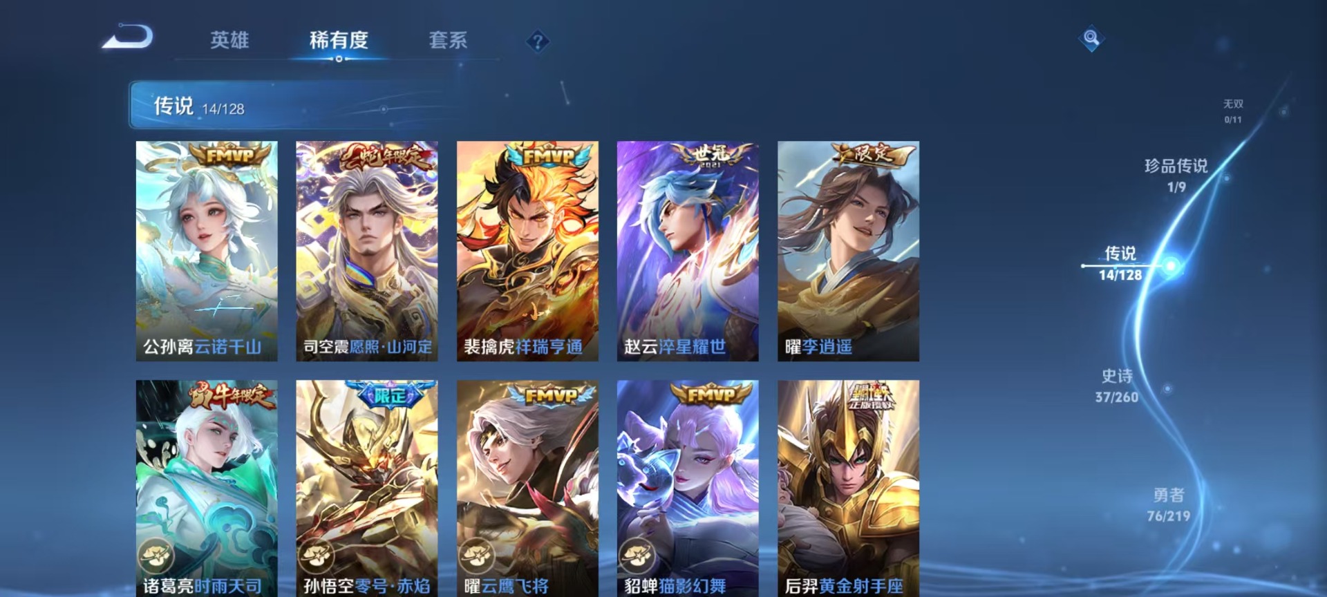 刘邦夺宝奇兵,夏侯惇朔风刀,老夫子醍醐杖,沈梦溪星空之诺,盾山御銮,曹操烛龙,典韦穷奇,牛魔御旌,鲁班七号狮舞东方,元歌云间偶戏,鲁班大师探海日志,明世隐疑决卦,马可波罗暗影游猎,鬼谷子原初探秘者,张良古海寻踪,女娲朔望之晖,狄仁杰万华元夜,程咬金演武夺筹,李元芳银河之约,弈星混沌棋,米莱狄御霄,钟馗神迹守卫,钟馗驱傩正仪,狂铁御狮
