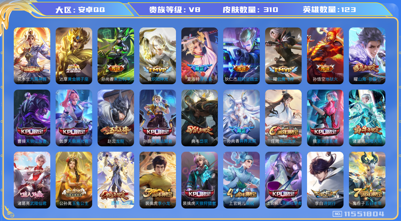 [11551804]V8 1典藏 15传说 123英雄 310皮肤 可修改实名 优质装备:九霄神辉(木兰典藏),黄金狮子座,云鹰飞将(小将军),炽阳神光,末日机甲-孙尚香(绿蚂蚱),地狱火,超时空战士-狄仁杰,山海·苍雷引(电光曜子),浮生妄 珍宝阁皮:妄想食味,女武神,玩趣恶龙 限定皮:愿照·山河定(司空震年限),鸣野蒿,武陵仙君(小桃花),异界灵契(白毛香),傲雪梅枪,时雨天司(水龙头),神威(电光马子),飞衡(韩信年限),高山流水,诗剑行,五谷丰年,天狼运算者,梁祝,天狼狩猎者,龙胆,岱宗(典韦年限),天狼溯光者,天狼征服者,天狼绘梦者,李小龙,逐梦之影,朱雀志(守约年限),孙行者,猪悟能,匿光追影者,玉兔公主 史诗皮:鸭鸭历险记-刘禅,化蝶舞,龙之律动,雪豹·霜爪,蔬乡物语(鲁班七号),百相守梦-黄忠,紫霞仙子,苍穹之光,电玩小子(小书包),白龙吟,黄金分割率,特工魅影,千年之狐,江河有灵,蒙恬荣光圣徽,冰冠公主,偶像歌手,白蛇,晚萤,电玩·爆裂旋风,暗夜猫娘,龙骑士(小龙虾),末日机甲-吕布,猫狗日记-孙策,猫狗日记-大乔,节奏热浪,修罗,女仆咖啡,水果甜心,绅士熊喵,天才门将,星夜王子,心灵骇客,功夫厨神,德古拉伯爵,暗隐猎兽者,幽灵船长,鬼剑武藏,天秀·启明,舞动绿茵,地狱岩魂,纤云弄巧,繁星吟游(呼啦呼啦),拒霜思,缤纷独角兽,乘风破浪,逐浪之夏,水晶猎龙者,曙光守护者,箭羽风息,金属风暴,原初追逐者,圣诞狂欢,圣诞恋歌,鹰眼统帅,暗夜贵公子,魅力维加斯,黎明之约,赏金猎手,无心,未来纪元-赵云