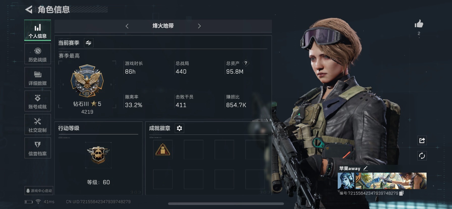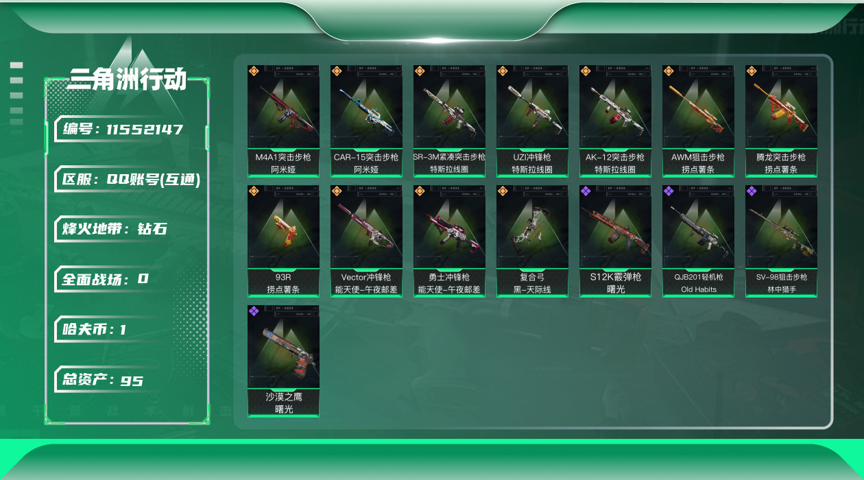 [11552147]总资产:95.8M 11传说枪械 哈夫币:1.101K 可二次 可修改实名 烽火地带段位:钻石 全面战场段位:尉官 传说武器皮肤:UZI冲锋枪-特斯拉线圈,AWM狙击步枪-捞点薯条,腾龙突击步枪-捞点薯条,93R-捞点薯条,AK-12突击步枪-特斯拉线圈,SR-3M紧凑突击步枪-特斯拉线圈,勇士冲锋枪-能天使-午夜邮差,Vector冲锋枪-能天使-午夜邮差,复合弓-黑-天际线,M4A1突击步枪-阿米娅,CAR-15突击步枪-阿米娅 史诗武器皮肤:QJB201轻机枪-Old Habits,SV-98狙击步枪-林中猎手,沙漠之鹰-曙光,S12K霰弹枪-曙光