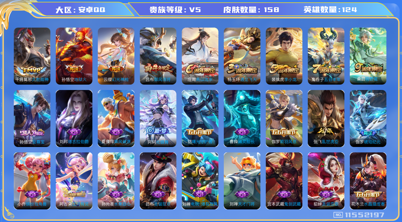 [11552197]V5 4传说 124英雄 158皮肤 可修改实名 优质装备:久胜战神,地狱火 传说皮:幻光神枪 珍宝阁皮:妄想食味,蔷薇恋人 限定皮:鸣野蒿,至尊宝,遇见飞天,高山流水,五谷丰年,御风骁将(吕布年限),李小龙 史诗皮:化蝶舞,琥珀纪元伽罗,江河有灵,偶像歌手,电玩·爆裂旋风,龙骑士(小龙虾),乱世虎臣,水果甜心,天才门将,星夜王子,心灵骇客,功夫厨神,德古拉伯爵,幽灵船长,鬼剑武藏,纤云弄巧,拒霜思,缤纷独角兽,乘风破浪,逐浪之夏,水晶猎龙者,曙光守护者,箭羽风息,圣诞狂欢,圣诞恋歌,鹰眼统帅,魅力维加斯,黎明之约,未来纪元-赵云