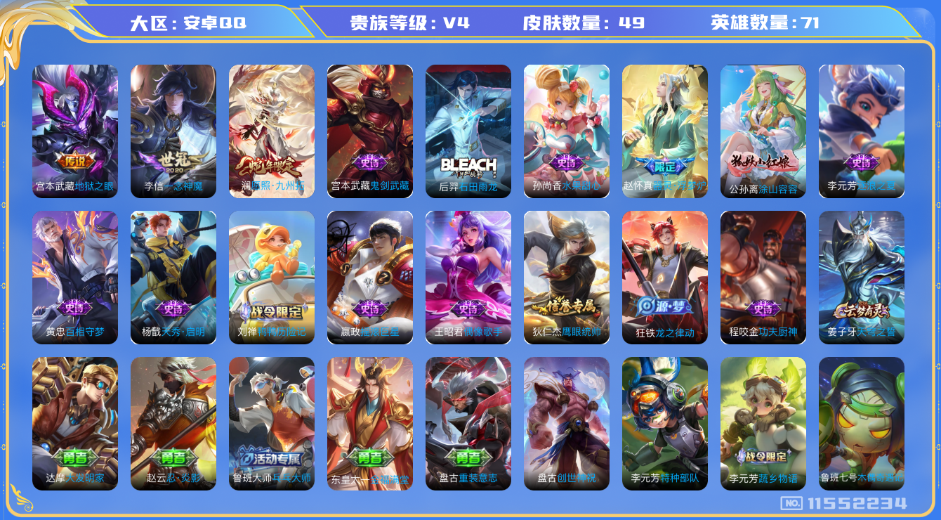 [11552234]V4 3传说 71英雄 49皮肤 可修改实名 优质装备:一念神魔,地狱之眼,涂山容容 限定皮:愿照·九州拓(澜年限) 史诗皮:鸭鸭历险记-刘禅,器灵·浮梦炉,龙之律动,石田雨龙,百相守梦-黄忠,偶像歌手,摇滚巨星,水果甜心,功夫厨神,鬼剑武藏,天秀·启明,逐浪之夏,鹰眼统帅