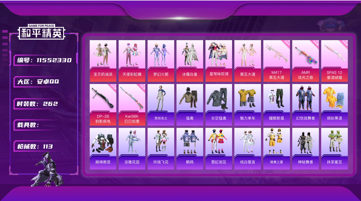 [11552330]6粉装 5特效枪 可二次 可修改实名 女号 优质装备:梦幻火箭(新101)(新火箭少女101粉色套装),宝贝奶油派,天使彩虹糖,冰霜白皇,M417第五大道,AMR炫光之旅,SPAS-12蜜语绒猫,七级M417-第五大道,星穹咏叹调,Kar98K-巳巳如意 热门装扮:第五大道 稀有枪皮:DP-28-豹影疾电 六级特效枪:六级AMR-炫光之旅 三级特效枪:三级DP-28-豹影疾电,三级SPAS-12-蜜语绒猫 二级特效枪:二级Kar98K-巳巳如意 紫色装扮:轻风白浪,SS22特训,莱茵河畔,SS23特训,幻彩翩翩,妙红点点,娇憨猪猪,樱桃黑巧,萌趣咩咩,SS21特训,霓虹热舞,SS30特训套装,SS20特训,梦起落英,潮流游乐家,SS15特训,星河入梦,SS13特训,治愈之星,科技之星,SS14特训,萌趣颜团子,吉莉礼服,长空猛禽,霓虹街区,缤纷果语,耀眼新星,飞行日记,魅力单车,鹤鸣,麻辣教官,龙的传人,龟仙人,柠萌假日,幻世战舞者,福星高照,空岛之星,牛气冲天,牛气满满,猛禽,巳巳如意,竞技名士,惊鸿侠骨,SS24特训(SS24特训套装),SS25特训,锦衣飞扬,2B战斗服款,SS27特训,牛仔情诗,华灯初上,SS26特训,春光漫游,快闪甜心,淡雅花蕊,玲珑飞花,神秘舞者,大橘大利,SS12特训,抹茶蜜豆,薄荷蓝莓,纯白誓言,暗夜契约,耀粉歌者,绯格组合,萌黄之夏 优质战备:圣堂之誓降落伞,闲梦青缨降落伞,海螺星光降落伞,垂柳戏鸭降落伞,未来歌姬降落伞,第五大道降落伞,甜心宝贝降落伞,春暖花开降落伞,飞行器-春暖花开,梦幻火箭降落伞,梦幻火箭飞行器,甜蜜誓约降落伞,飞行器-甜蜜誓约,夏日绵绵冰降落伞,四圣焕新降落伞,飞行器-激战未来,银刃赛罗降落伞,王牌四分卫降落伞,暗夜玫瑰降落伞